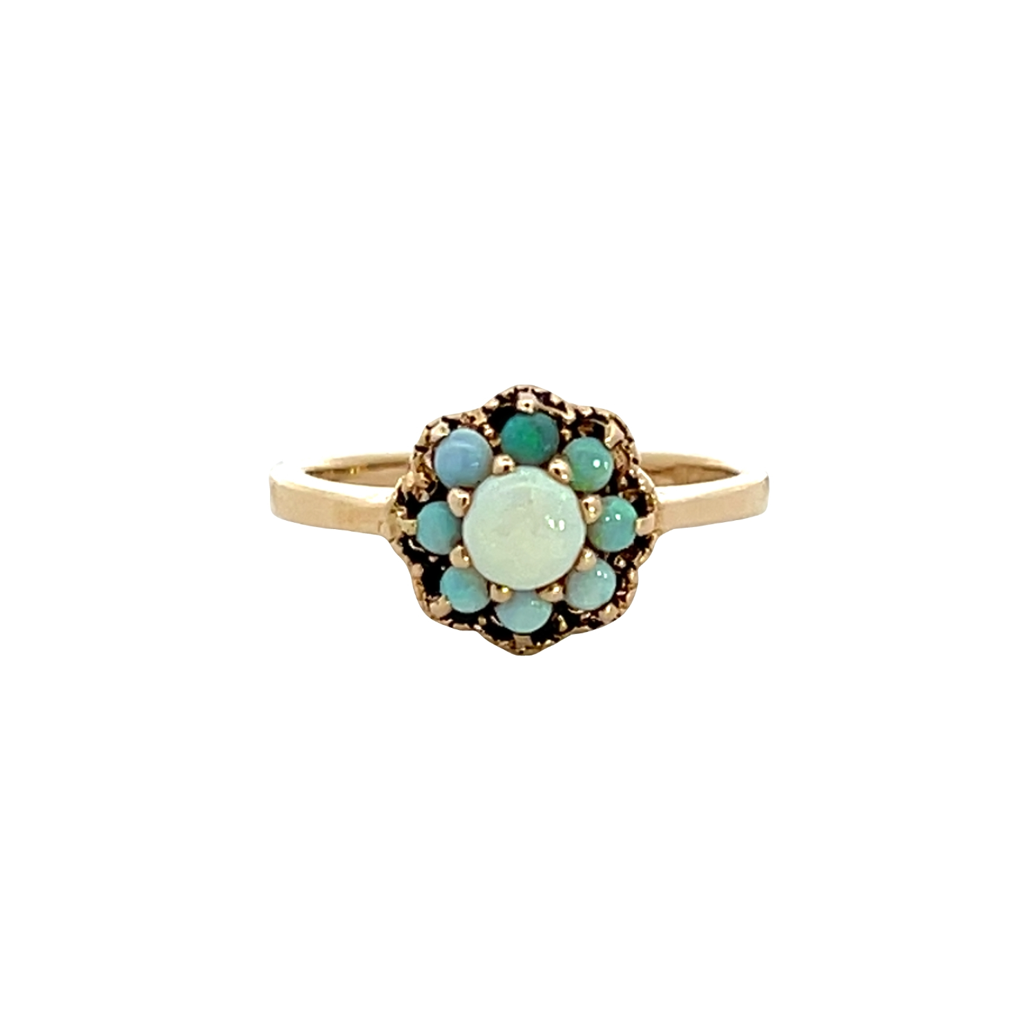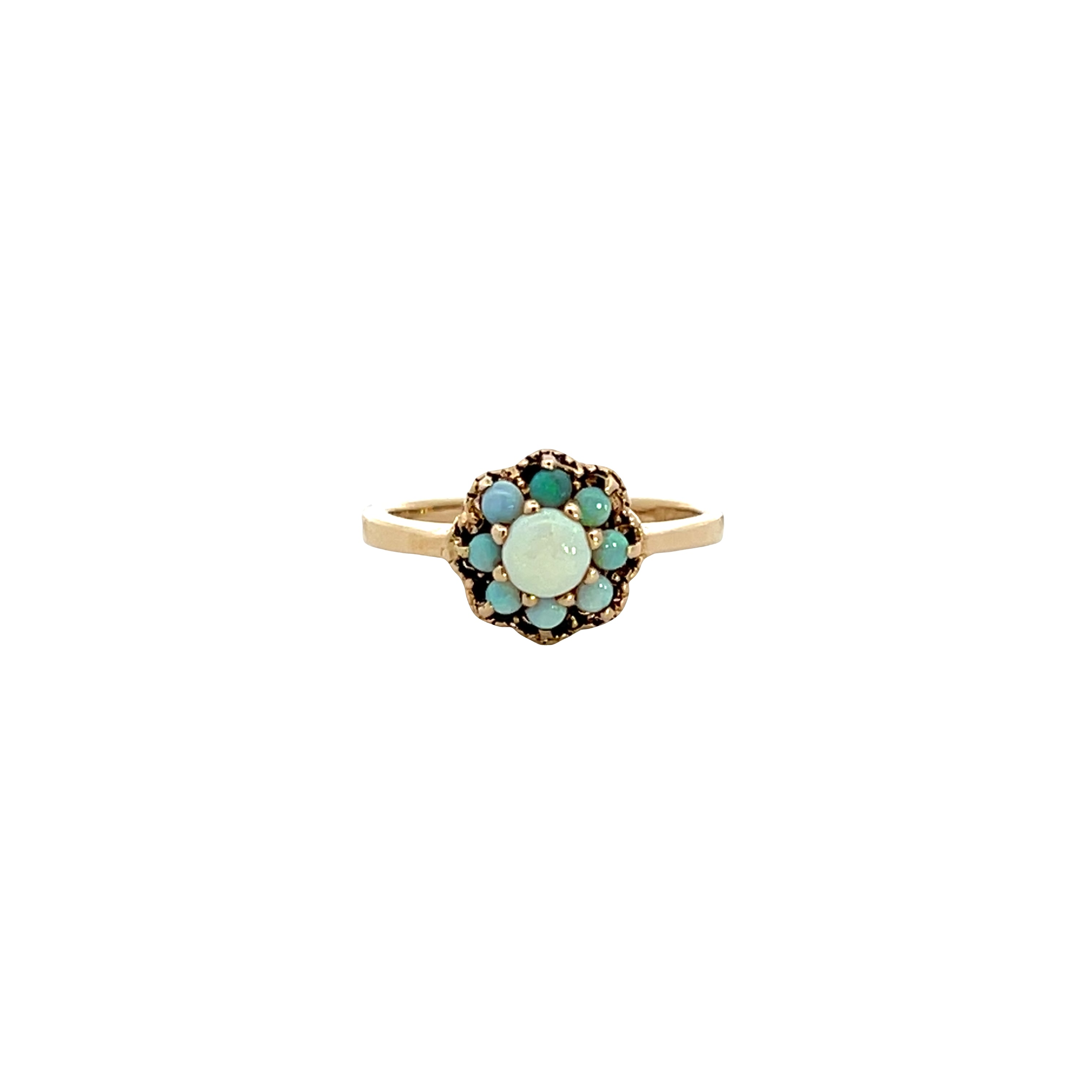 This estate 10K yellow gold ring features a halo design showcasing white base opals in beautiful blue-green tones. The larger center opal is surrounded by smaller opals that create a charming cluster effect. This ring is a colorful vintage piece that offers unique character and natural beauty.Details