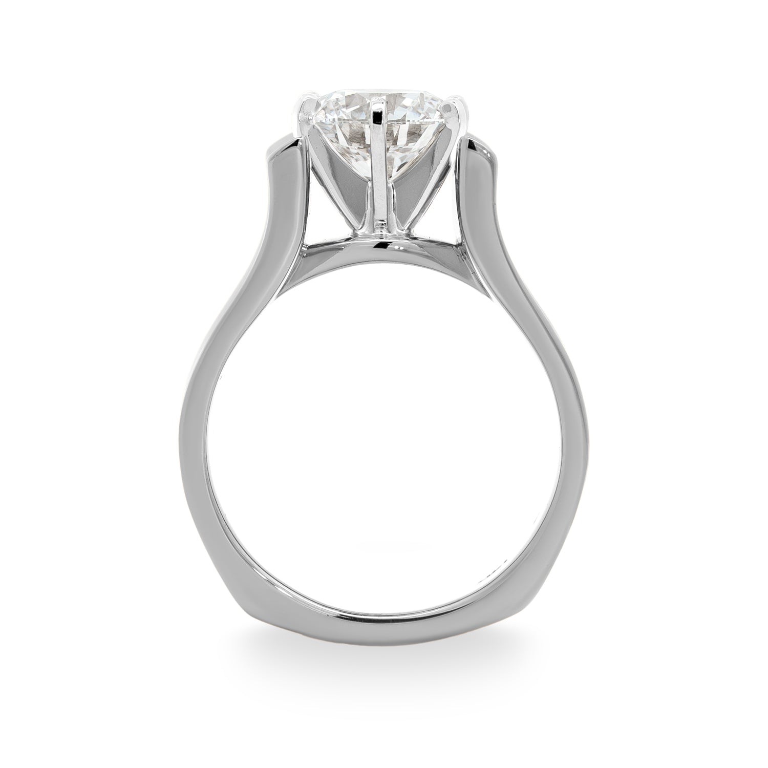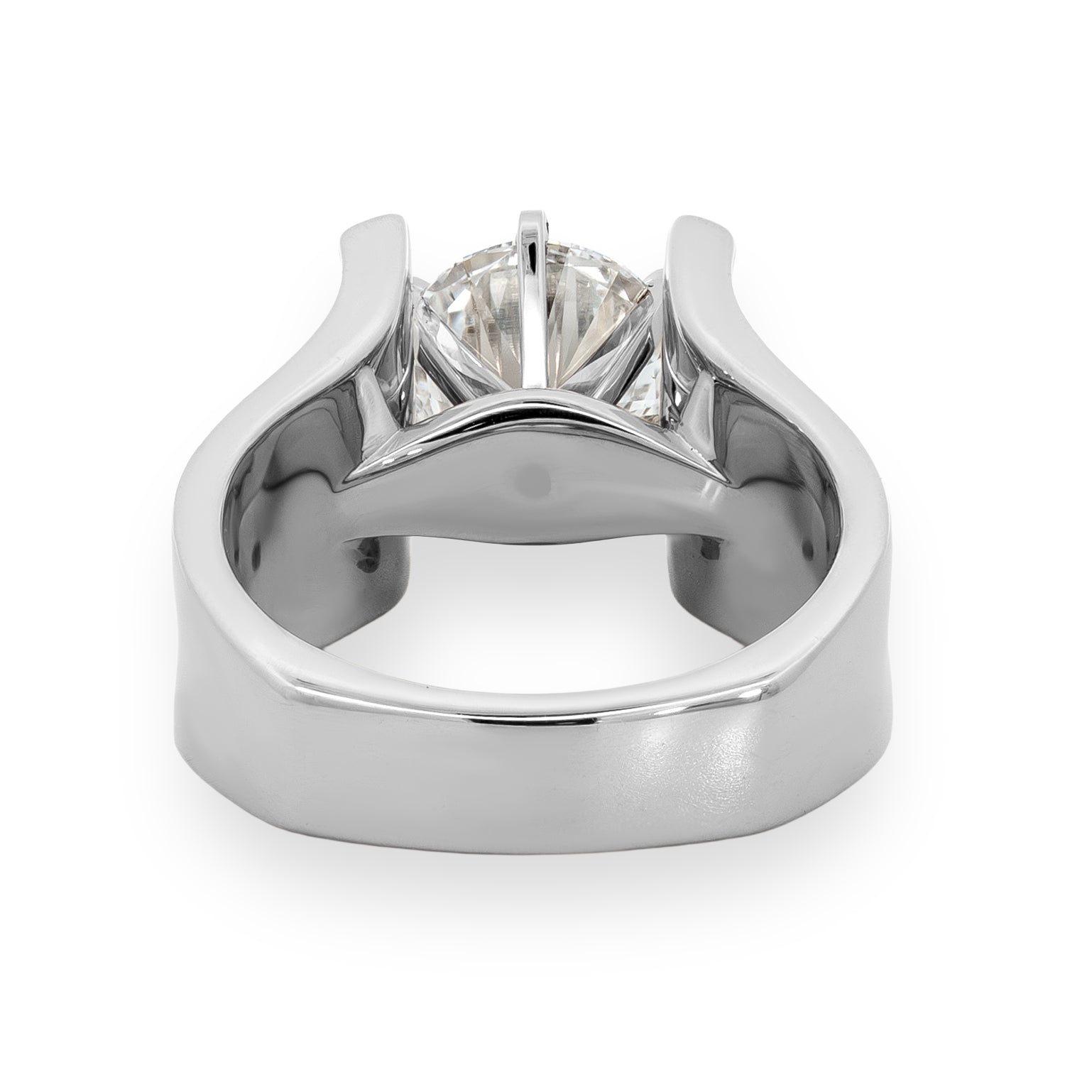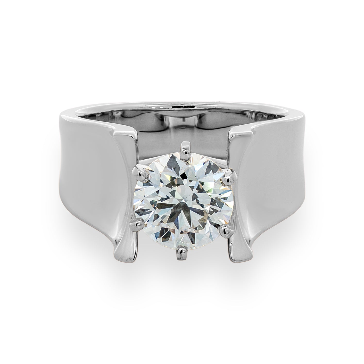 This 14K white gold Bensel Made wide solitaire ring features a round brilliant cut lab grown diamond secured in a six-prong setting. The substantial design and clean lines of the shank create a modern silhouette that emphasizes the diamond’s brilliance with a bold yet refined presence.Details