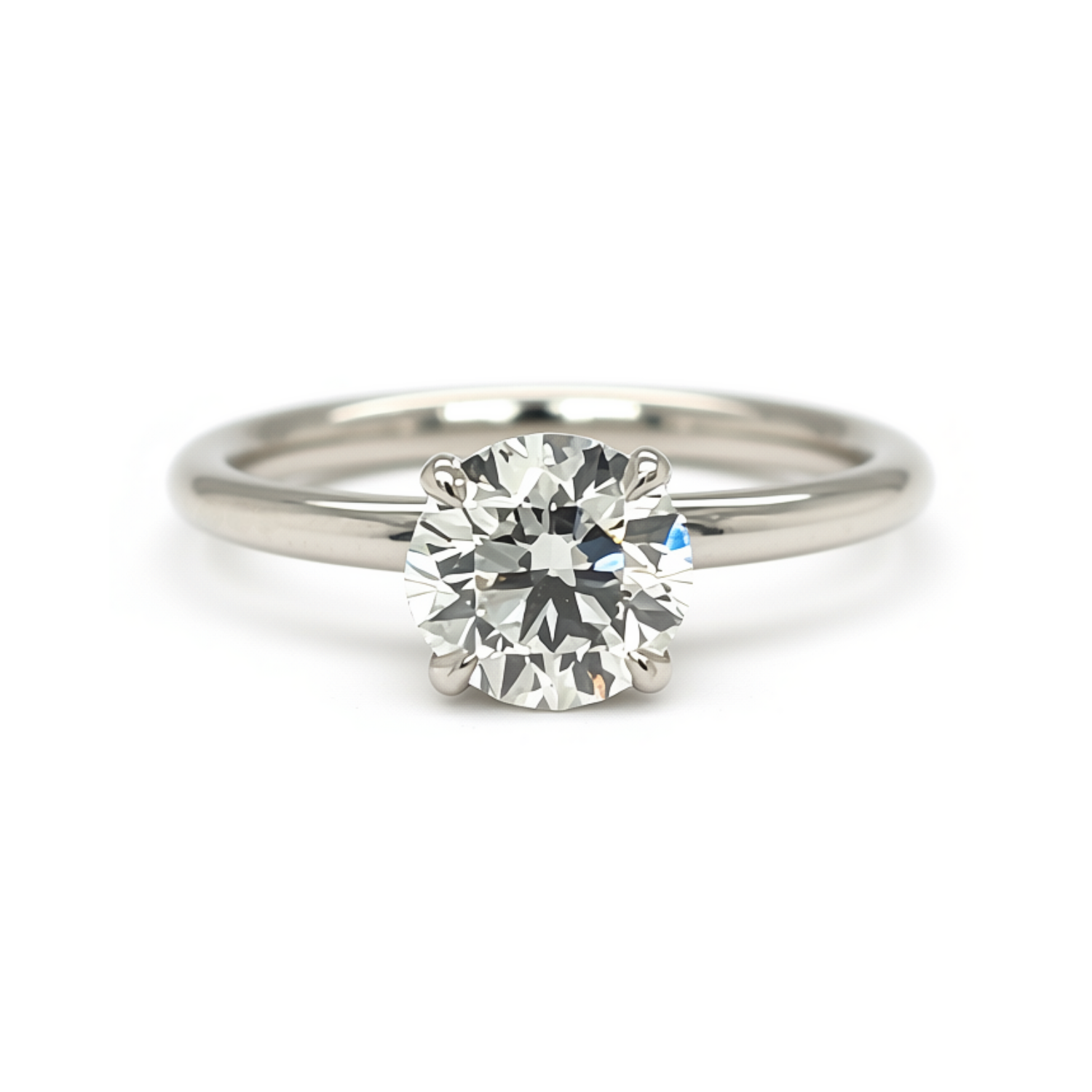 This 18K white gold Bensel Made solitaire engagement ring features a round brilliant cut diamond secured in a classic four-prong setting. The smooth, rounded shank offers a refined and comfortable fit, designed to showcase the diamond’s natural brilliance with understated sophistication.Details