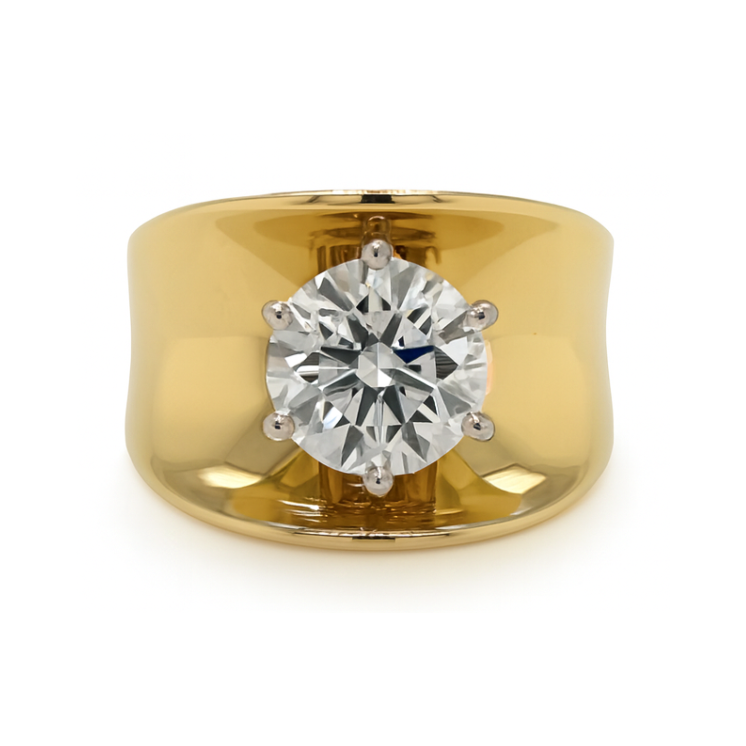 This 18K yellow gold and platinum Bensel Made saddle ring showcases a striking round brilliant cut lab grown diamond in a refined six-prong platinum setting. The bold curvature of the shank contrasts beautifully with the diamond’s precision-cut brilliance, merging modern craftsmanship with sculptural sophistication.Details