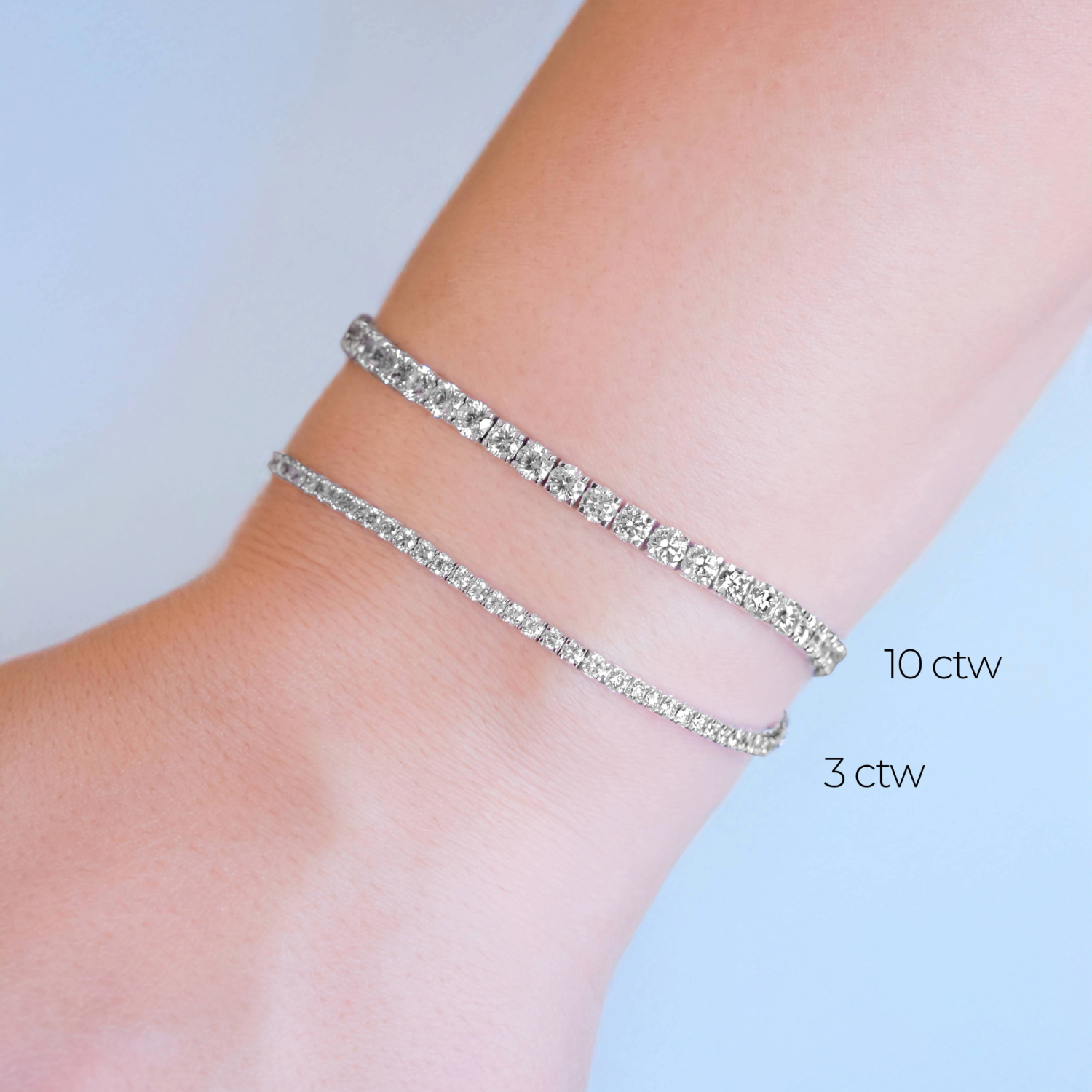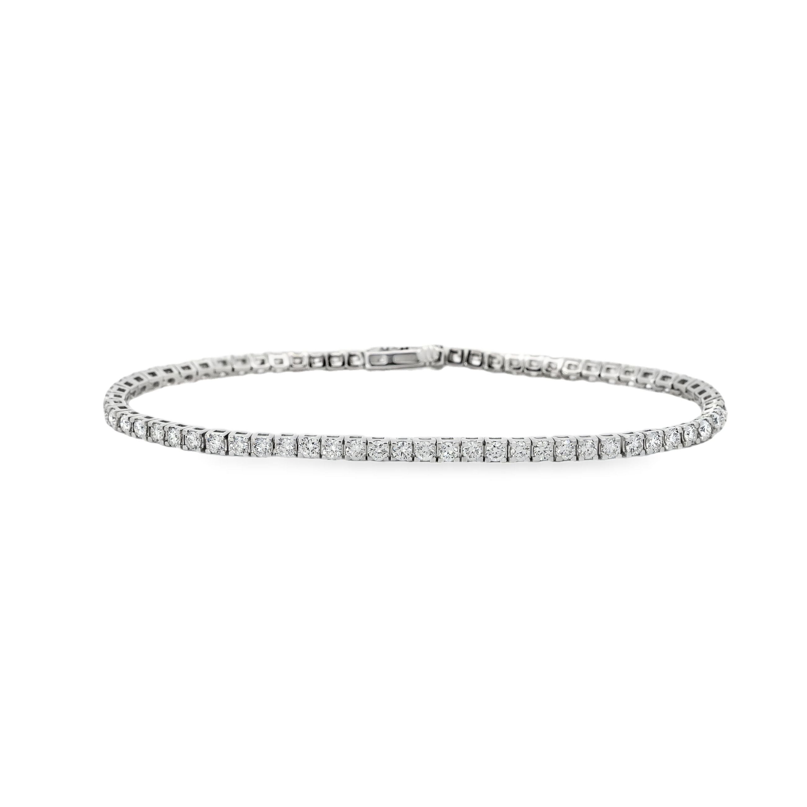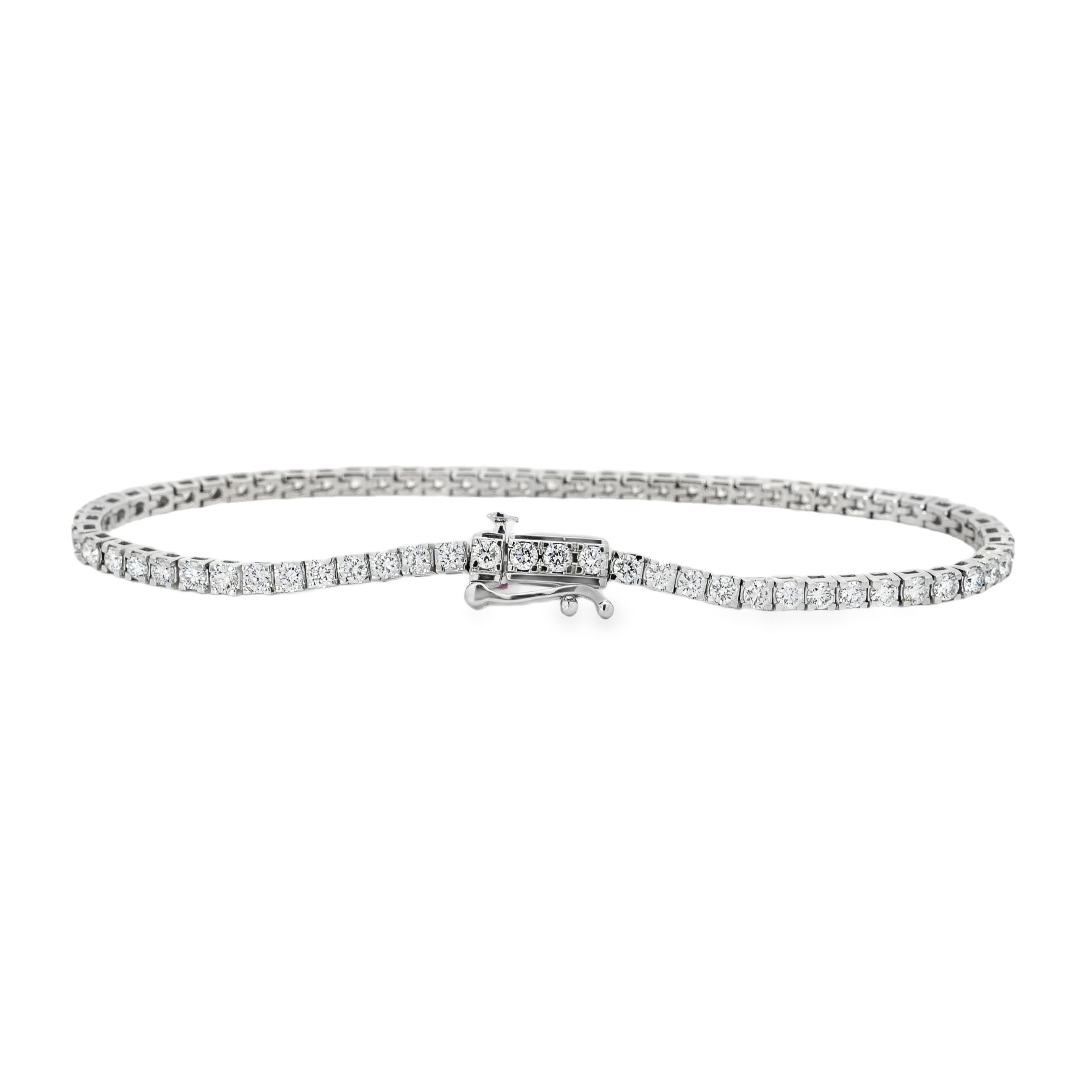 7" 14 karat white gold tennis bracelet set with 69 round brilliant cut lab grown diamonds at 3 carat total weight with F color and VS1 - VS2 clarity, equipped with a box style clasp and figure eight style safety mechanism.Details