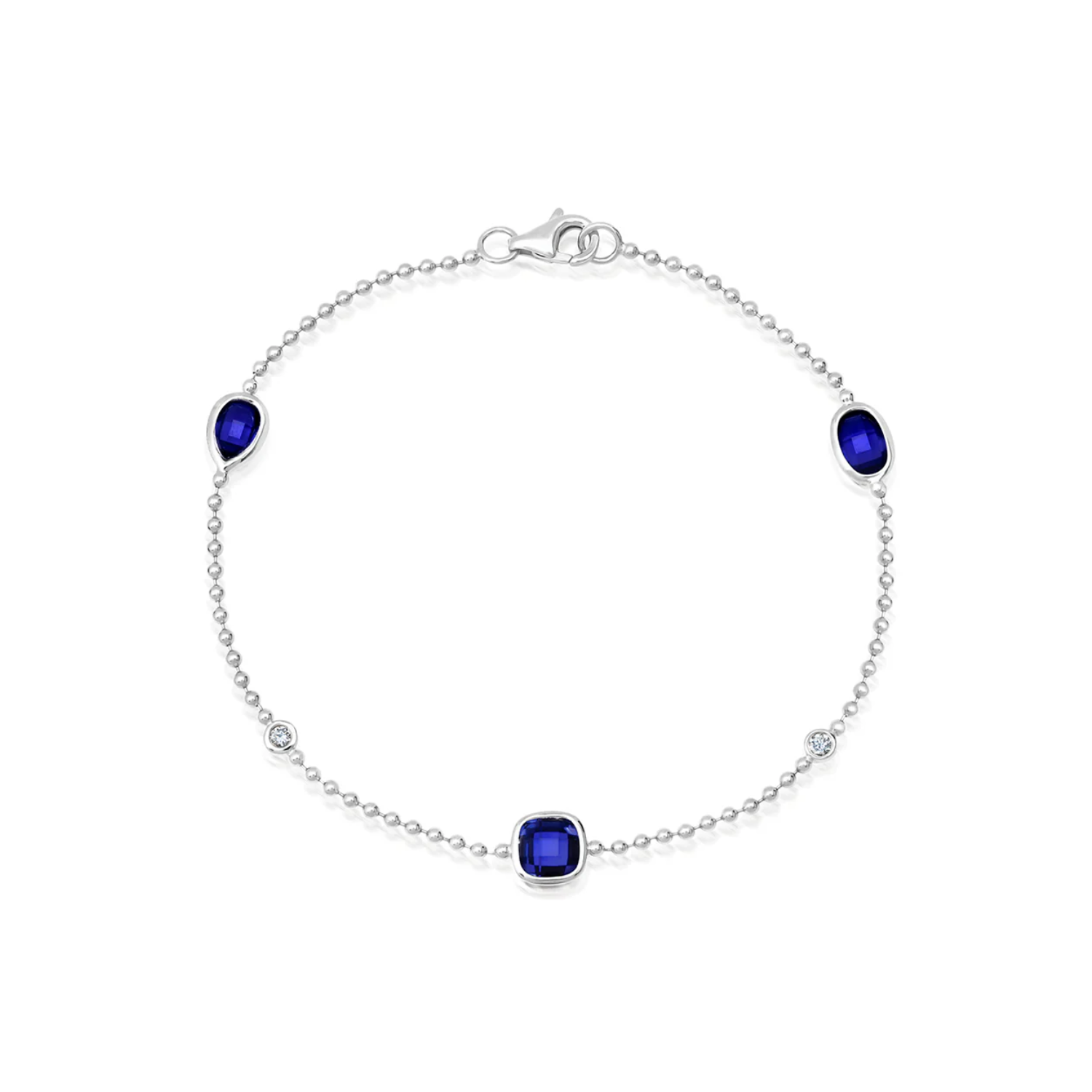 7" 14 karat white gold station bracelet bezel set with one checkerboard cushion, one checkerboard pear shape, and one checkerboard oval Chatham lab grown blue sapphires at 2.16 carat total weight, accented with two bezel set round brilliant cut lab growndiamonds at 0.06 carat total weight with E - F color and VS1 - VS2 clarity, equipped with a lobster claw style clasp.Details