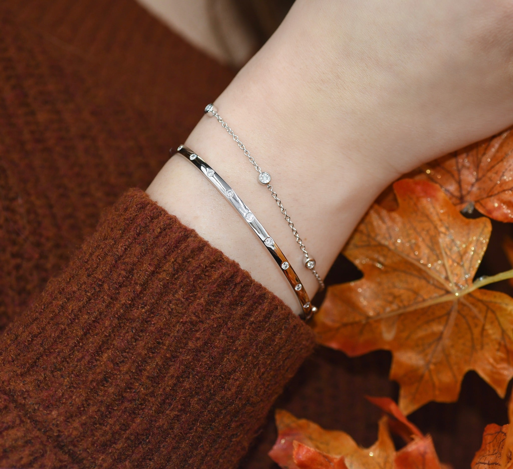 Emanating delicate elegance, this 14K white gold station bracelet is intricately adorned with 10 round brilliant cut diamonds, one on either side of each setting. Each diamond is strategically placed along the bracelet, providing subtle, twinkling accents. Its slender design and the lustrous white gold underscore its delicate appearance, while the sparkle of the diamonds adds a refined touch. This dainty and graceful piece is perfect for those seeking understated sophistication in their jewelry collection.