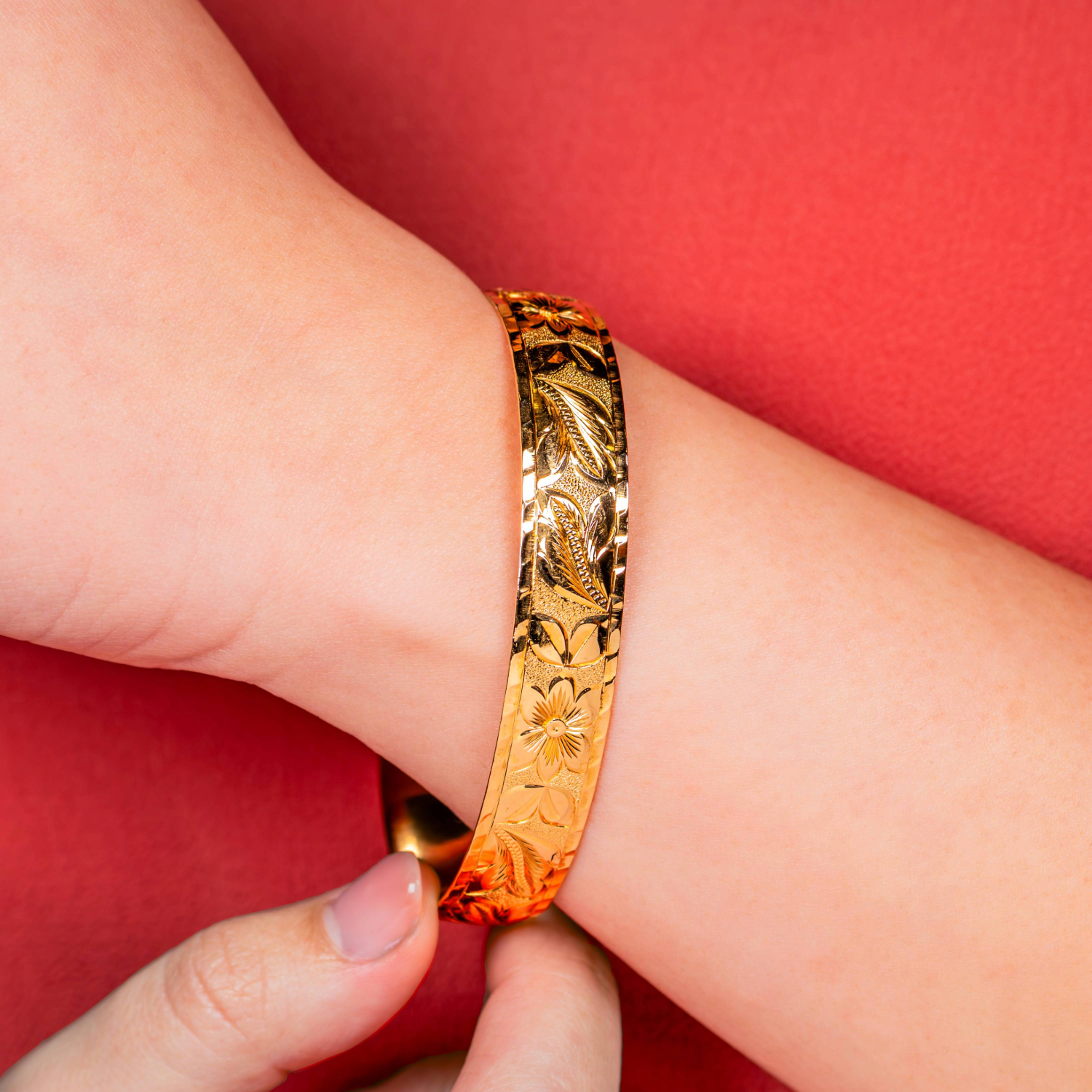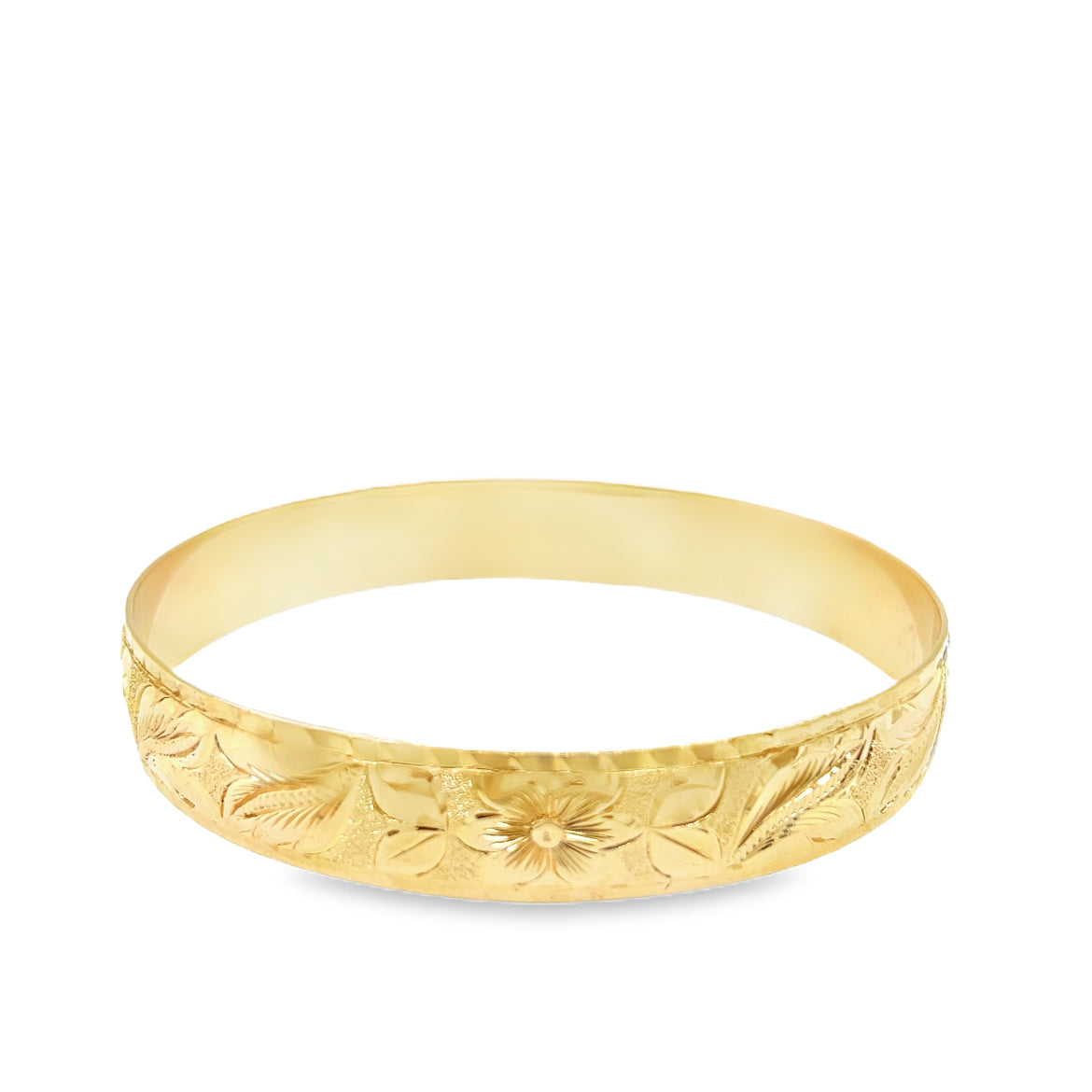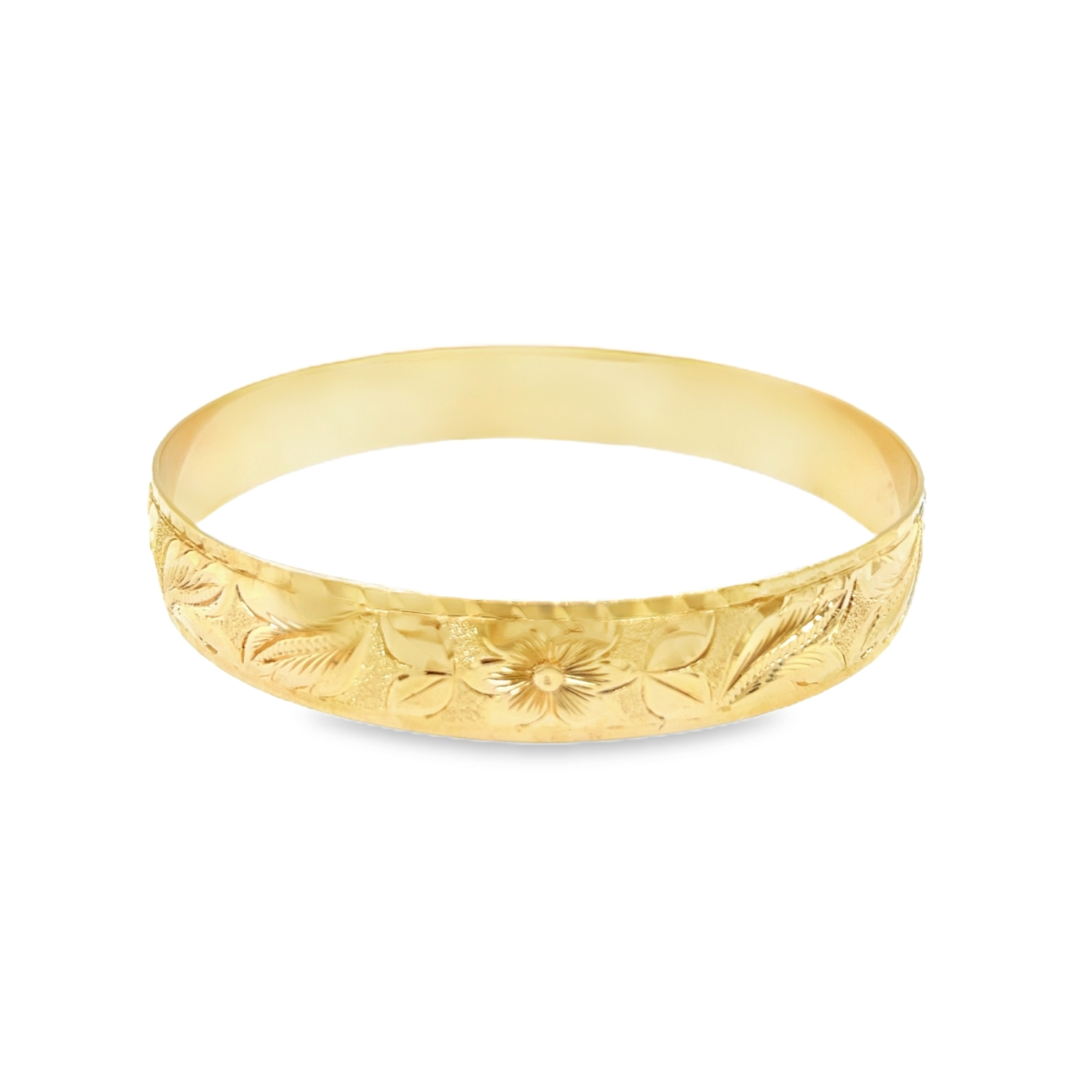 14K Yellow Gold 12 mm NaHoku Hawaiian Heirloom Plumeria Scroll-Around Bangle Bracelet