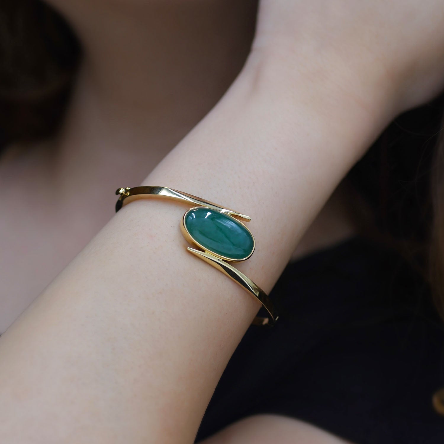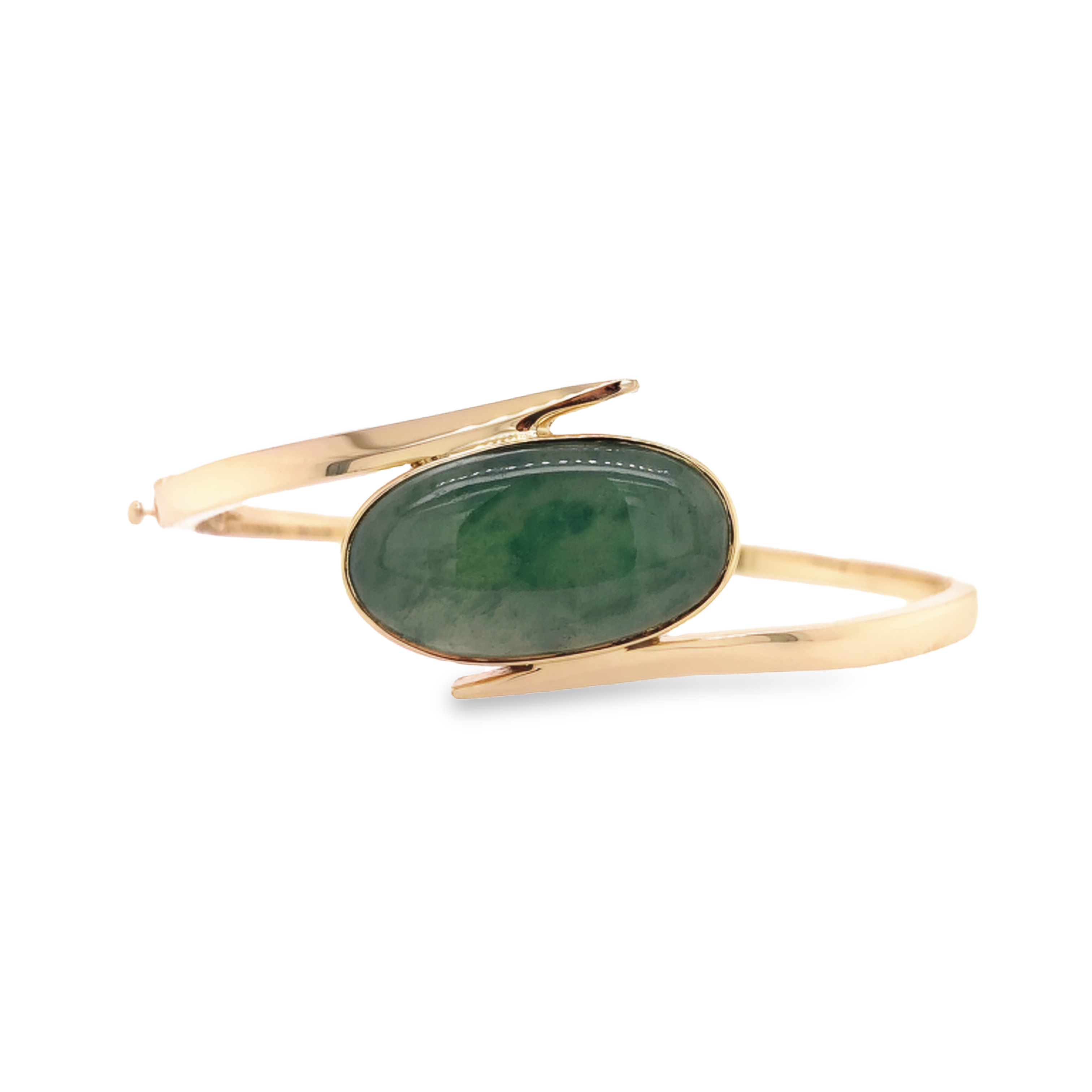 Elevate your jewelry collection with this exquisite 14K yellow gold estate hinged bangle, showcasing a magnificent bezel set oval Nephrite Jade at its center. The deep, verdant hues of the Nephrite Jade are beautifully complemented by the warm and lustrous sheen of the yellow gold. Whether worn as a statement piece or paired with other cherished jewels, this bangle is a testament to refined taste and craftsmanship. A blend of luxury and tradition, this bracelet is perfect for those who appreciate the finer things in life.