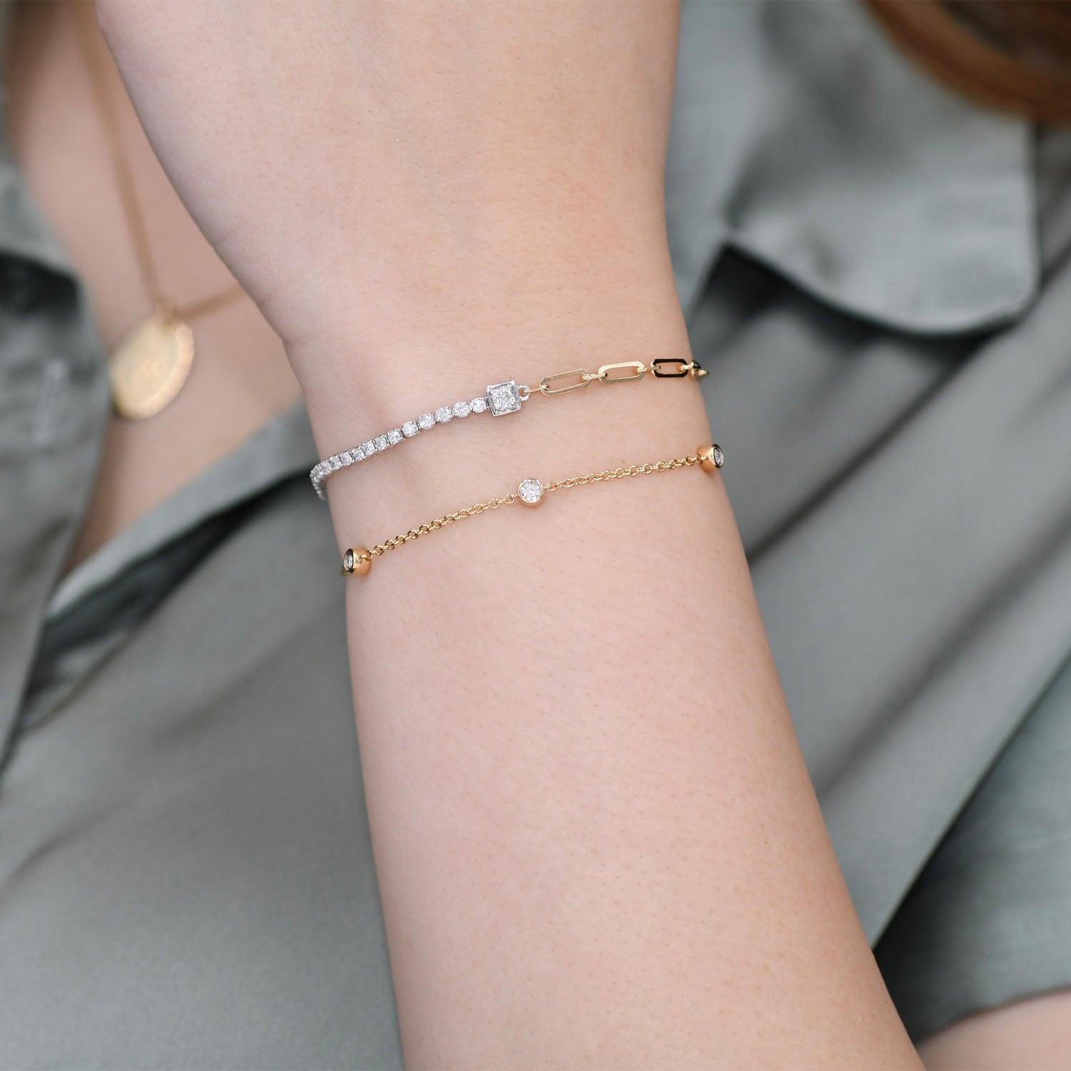 Exuding a delicate charm, this 14K yellow gold station bracelet is meticulously set with 10 round brilliant cut diamonds, one on either side of each setting. Each diamond, strategically spaced, offers a subtle, gleaming accent to the warm gold hue of the bracelet. The slender design of the bracelet, combined with the soft sparkle of the diamonds, lends a refined and delicate aesthetic. This graceful and understated piece is an ideal choice for those who appreciate subtle elegance in their jewelry collection.Details