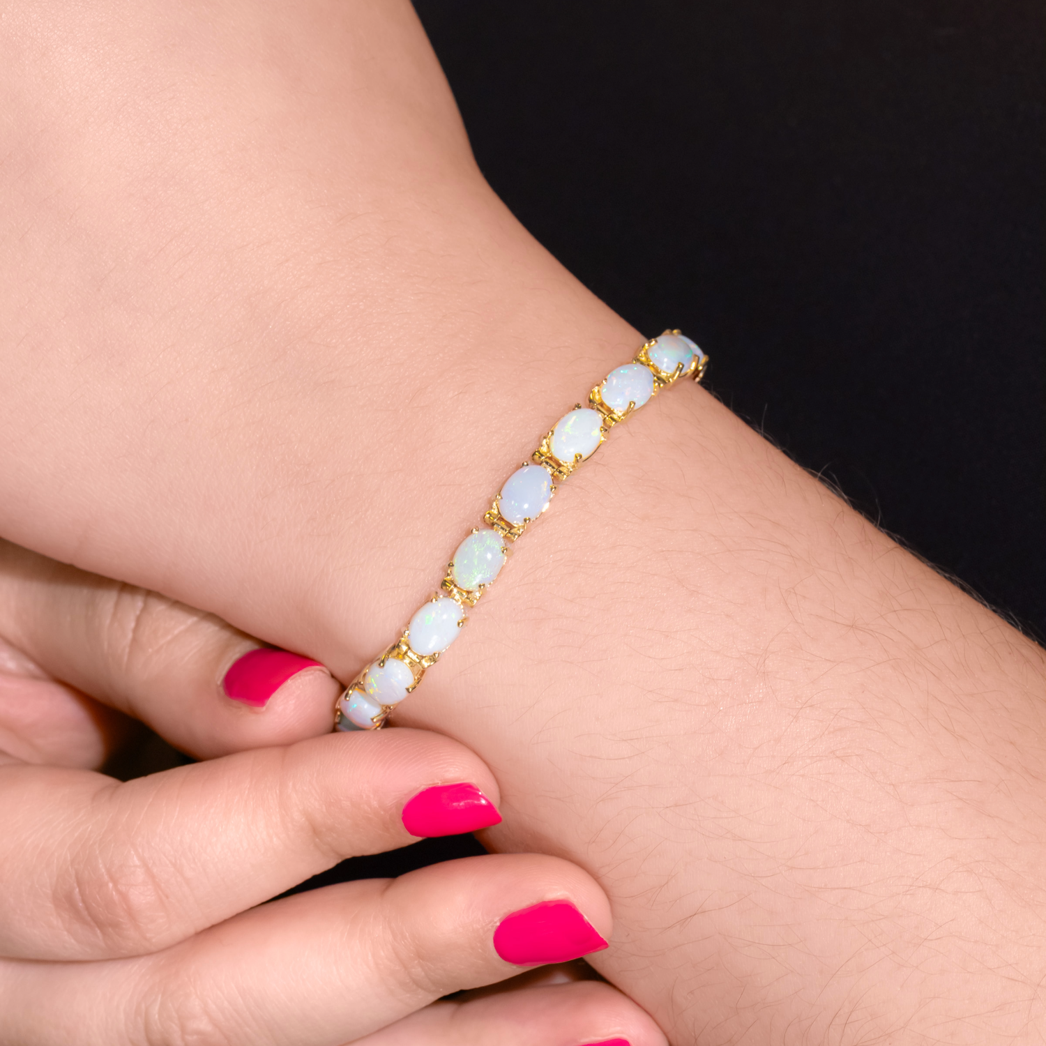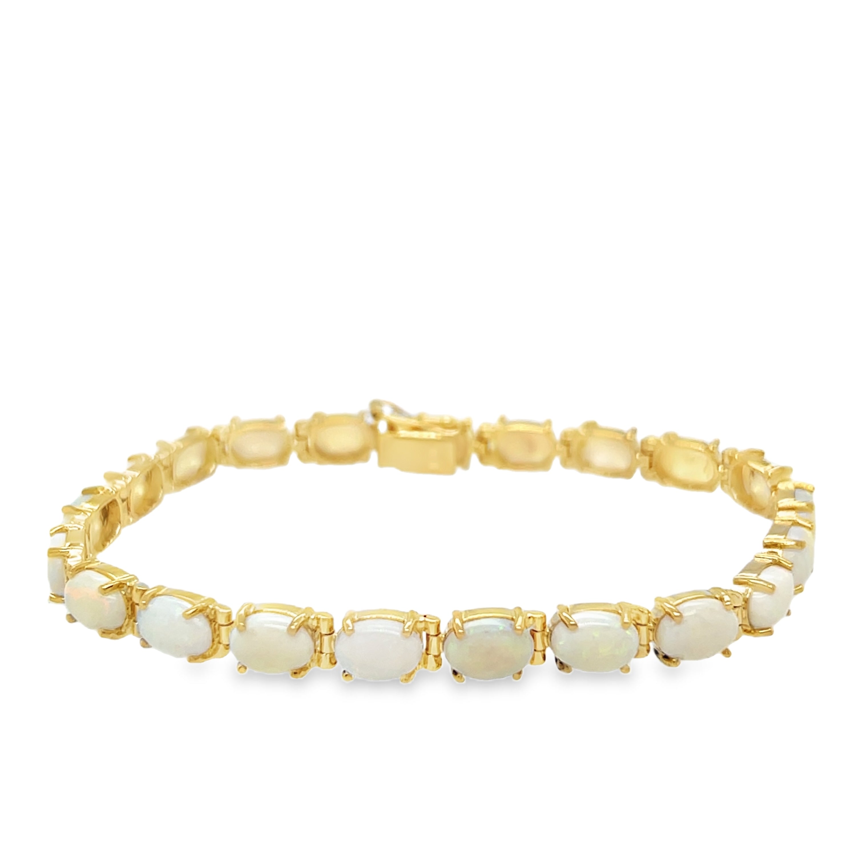 This 14K yellow gold estate bracelet showcases stunning Australian white base opals, each stone displaying a mesmerizing play of color. The opals shimmer with vibrant hues as they catch the light, making this piece truly captivating. A timeless design that highlights the beauty of opals, perfect for adding a touch of elegance to any occasion.Details