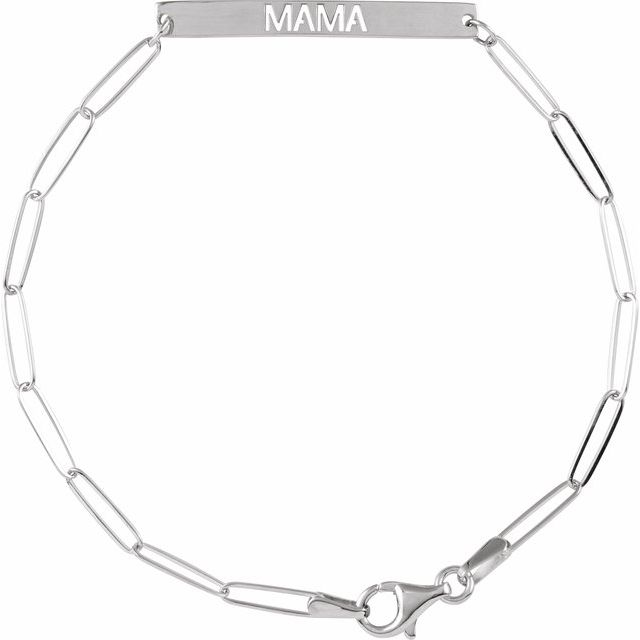 Sterling silver “MAMA” bar bracelet. The clean bar design features bold lettering across the center, paired with elongated link details for a modern, structured look. Finished with a lobster claw style clasp, this bracelet offers a secure fit with a comfortable, everyday feel.Details