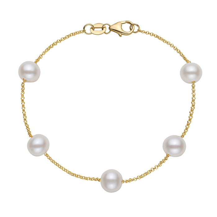 14K yellow gold bracelet set with five cultured freshwater pearls spaced evenly along a fine gold chain. Each pearl is individually placed to create a balanced and delicate design, allowing the soft luster of the pearls to stand out against the warm tone of the yellow gold. The bracelet is equipped with a lobster claw style clasp for secure and convenient wear. A refined piece that offers a light, graceful look, well suited for everyday wear or layering with other bracelets.Details