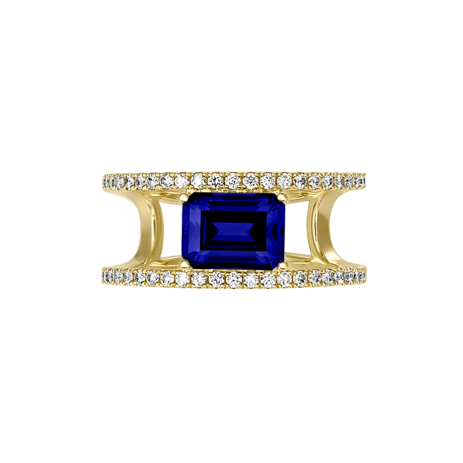 This 14K yellow gold fashion ring showcases a striking emerald cut Chatham lab grown blue sapphire held at the center of a modern, open silhouette. The sapphire’s rich blue hue is framed by two rows of round brilliant cut lab grown diamonds, adding brilliance from every angle. The open design creates an airy, sculptural look while offering a secure and balanced setting for the center stone.