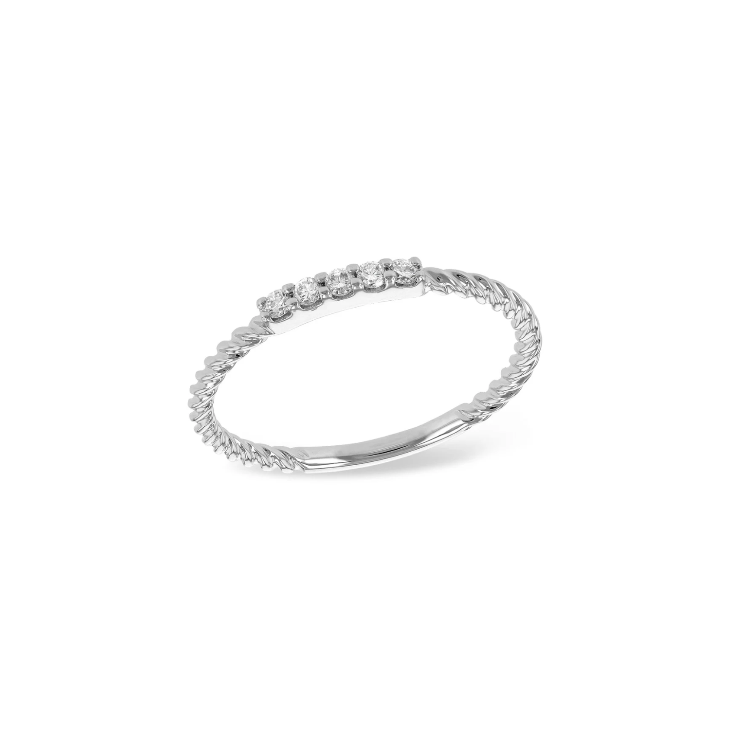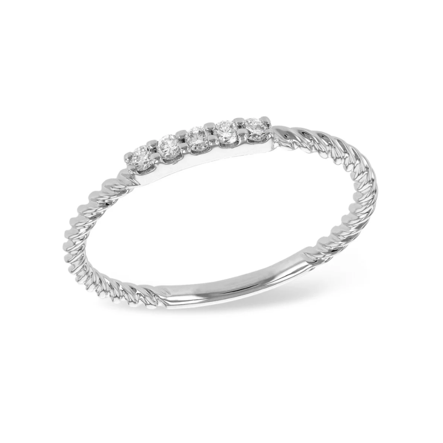 This 14K white gold stackable diamond band is a testament to classic elegance and modern design. The band features a single row of round brilliant cut diamonds, each secured in a classic prong setting that highlights their individual beauty and collective sparkle. The 14K white gold band has been intricately crafted with a rope-like, twisted edge, adding texture and a contemporary twist to this timeless piece. Its design is perfect for stacking with other rings for a bold statement or wearing alone for a subtle touch of sophistication. This versatile band seamlessly blends with various styles, making it a perfect addition to any jewelry collection and an ideal gift for a special occasion or a significant milestone.Details