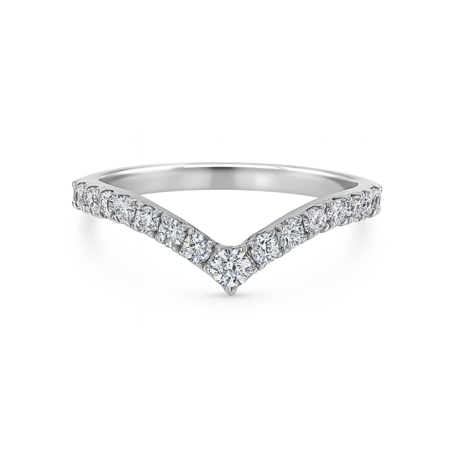This 14K white gold diamond band features a unique V-shaped design, adding a modern twist to the classic diamond band. The elegant curve is adorned with a row of sparkling diamonds, creating a stunning piece that complements any engagement ring or stands out beautifully on its own. Crafted from 14K white gold, this band combines timeless elegance with contemporary style.