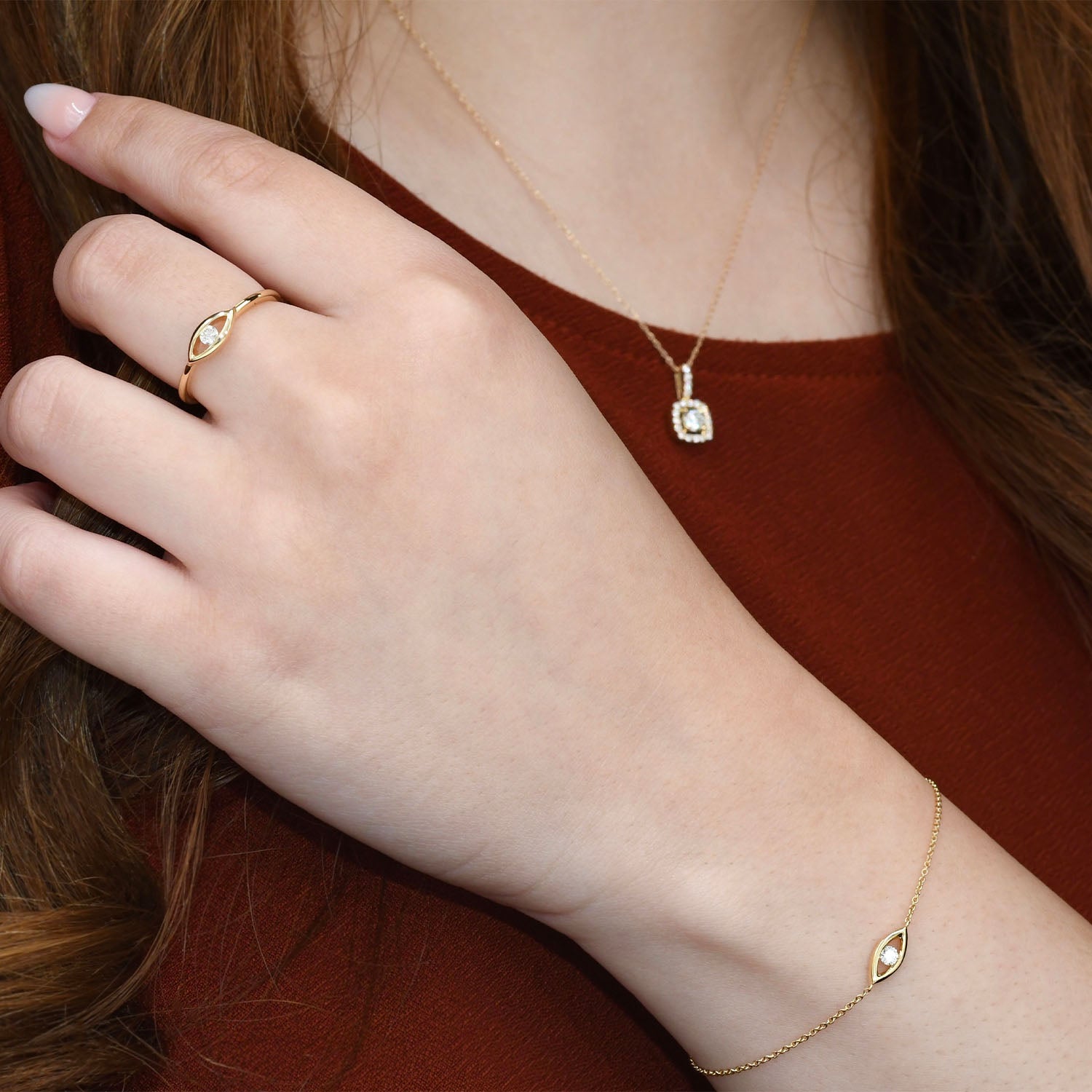 Embrace the ancient symbol of protection with this 14K yellow gold evil eye ring. At its heart, a shimmering diamond represents the eye's pupil, capturing light and reflecting its brilliance. The warm glow of yellow gold forms the iconic evil eye motif, offering both a touch of luxury and a sense of safeguarding. Perfect for those who value symbolic jewelry with a modern twist, this ring seamlessly blends cultural significance with contemporary design.