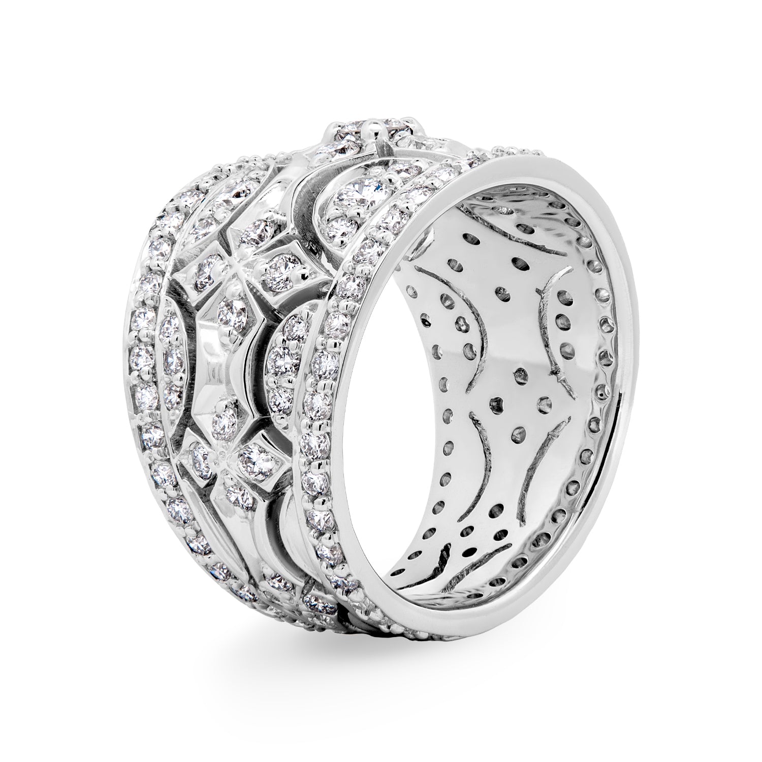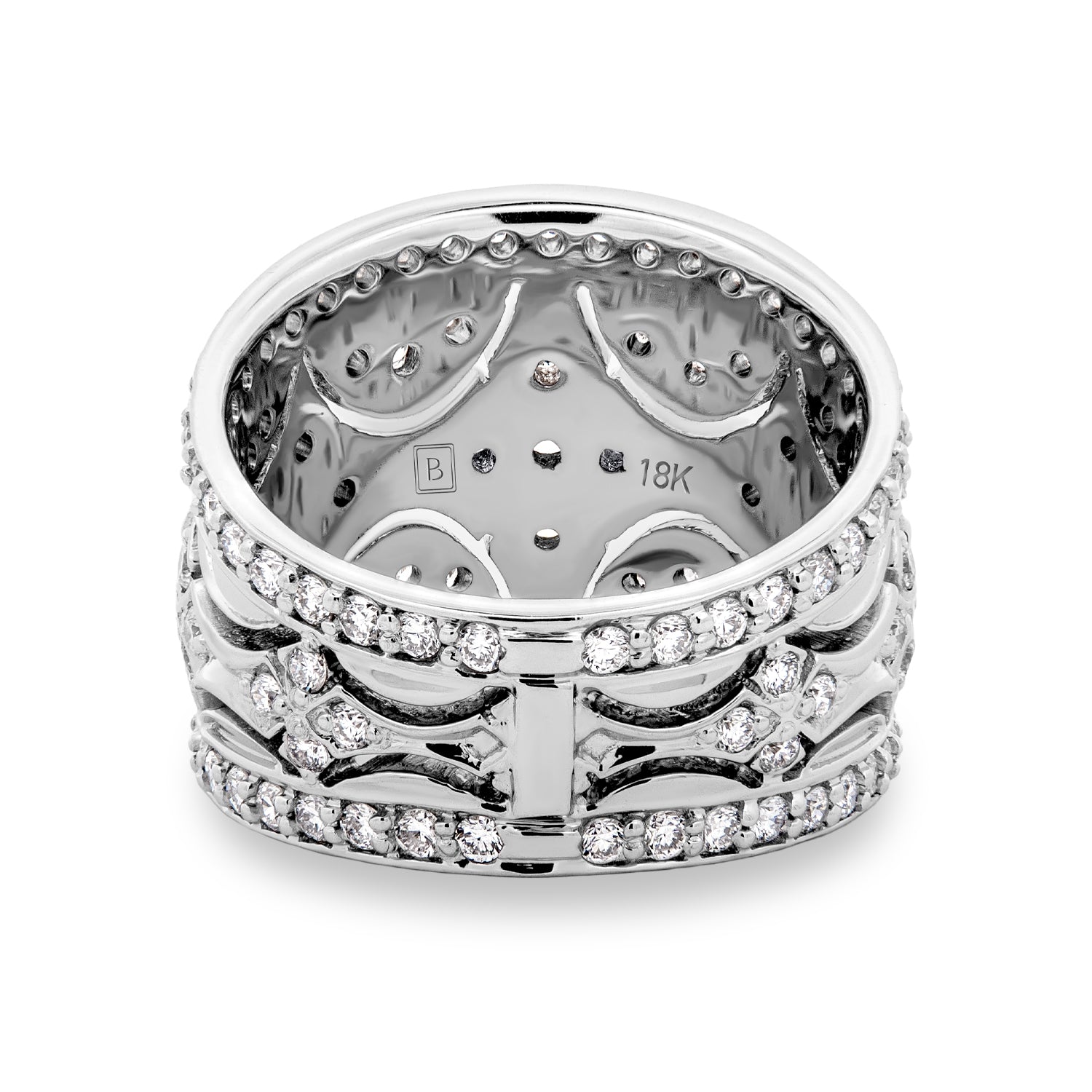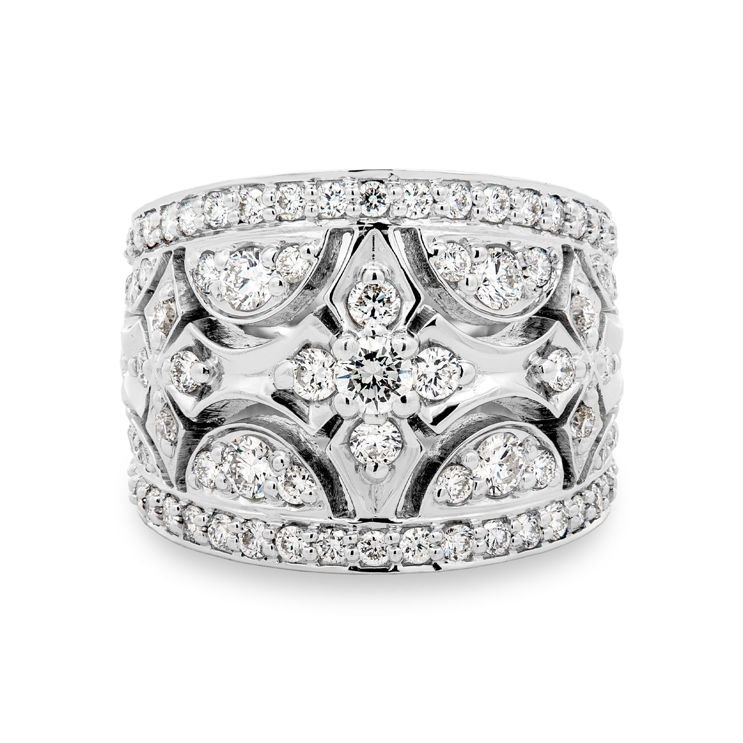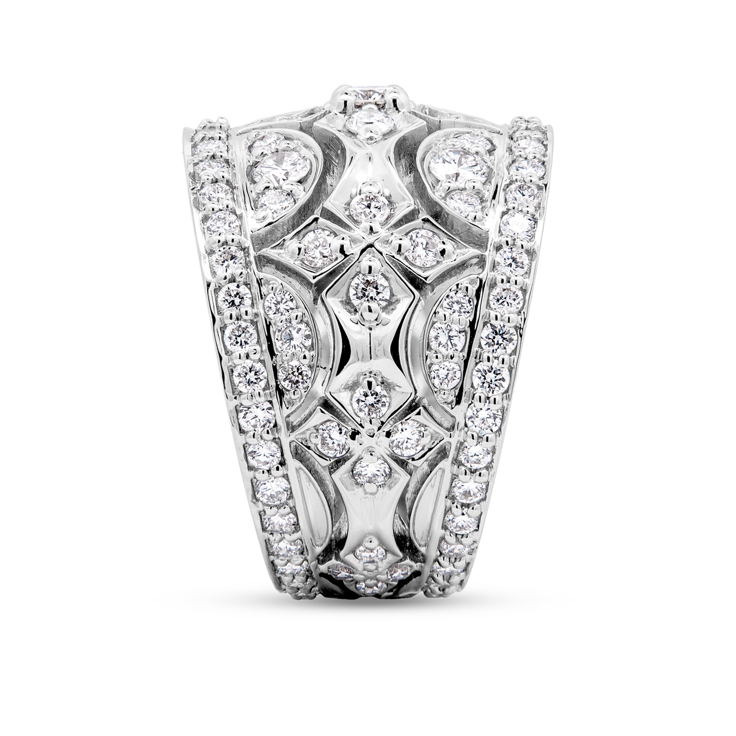 This Bensel Made fashion ring is crafted in 18K white gold and set with round brilliant cut lab grown diamonds in an ornate, wide-band design. Diamond-accented geometric and floral-style elements are arranged across the center of the ring, while continuous diamond rows border the top and bottom for a cohesive finish. The combination of high-polish metal, layered detailing, and precise diamond placement highlights the craftsmanship and presence of this distinctive piece.