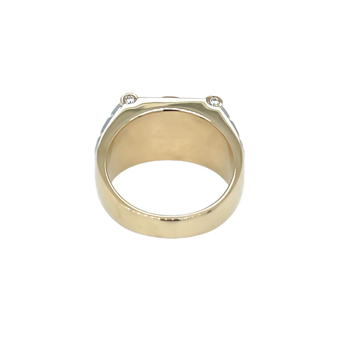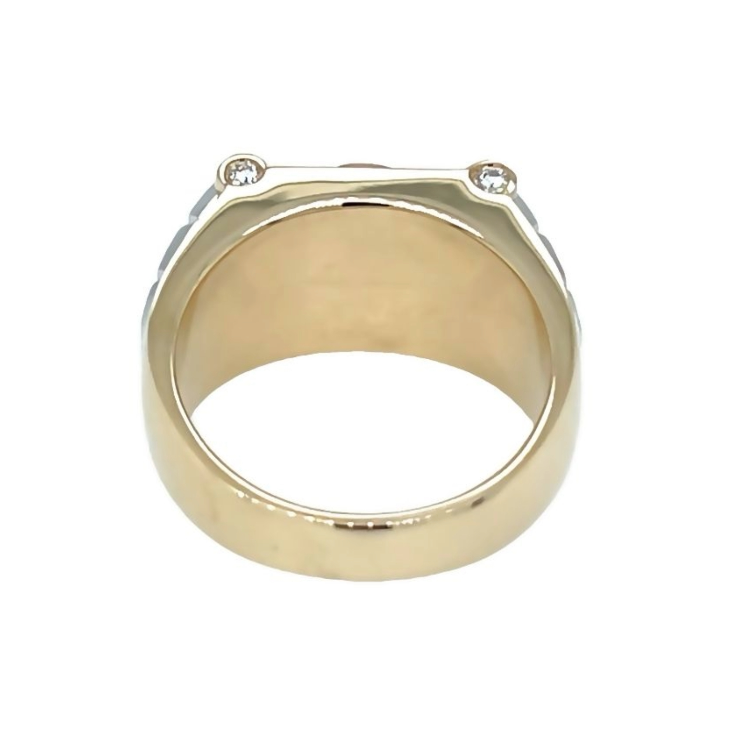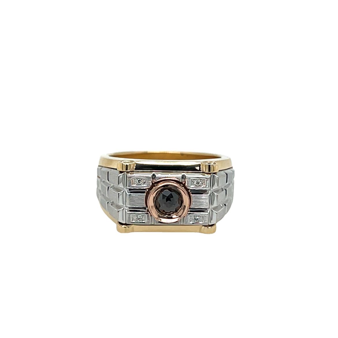 This striking men’s estate fashion ring combines the elegance of 14K white, yellow, and rose gold in a bold, geometric design. At its center, a fancy dark brown Crown of Light diamond, bezel-set in luxurious rose gold, adds a captivating depth of color. The surrounding white gold pattern is accented by diamond details that provide subtle brilliance, while the yellow gold edges frame the piece, adding a touch of warmth. A truly unique statement ring for those who appreciate refined craftsmanship with a modern twist.