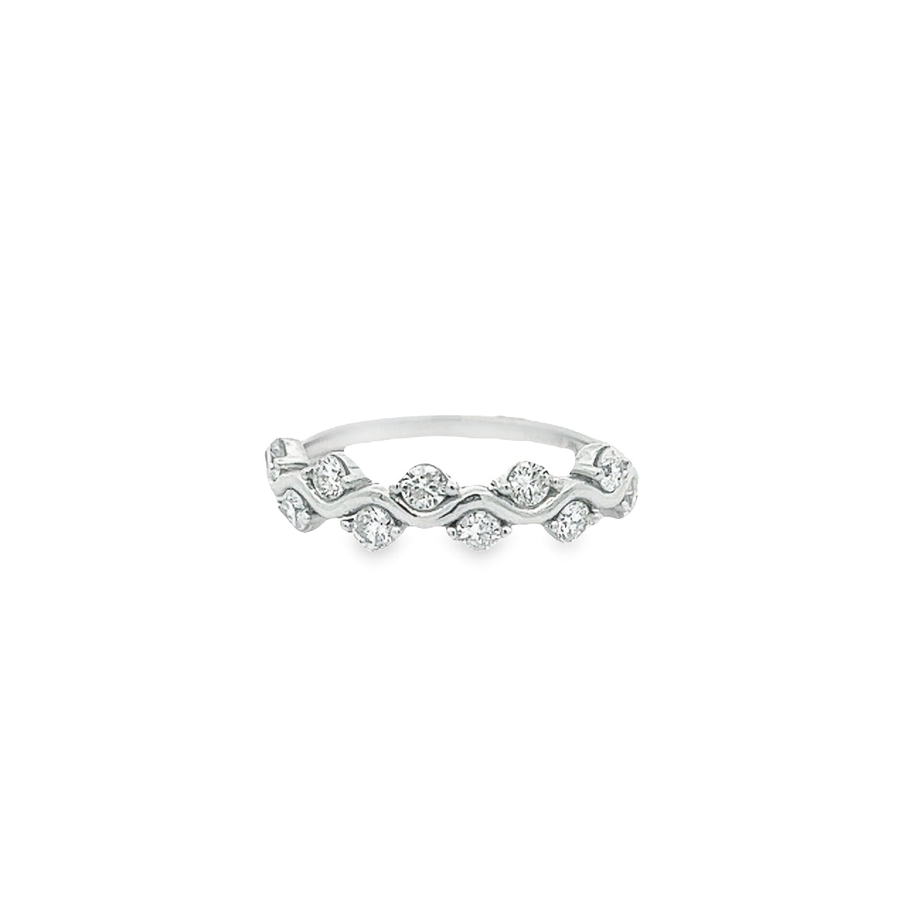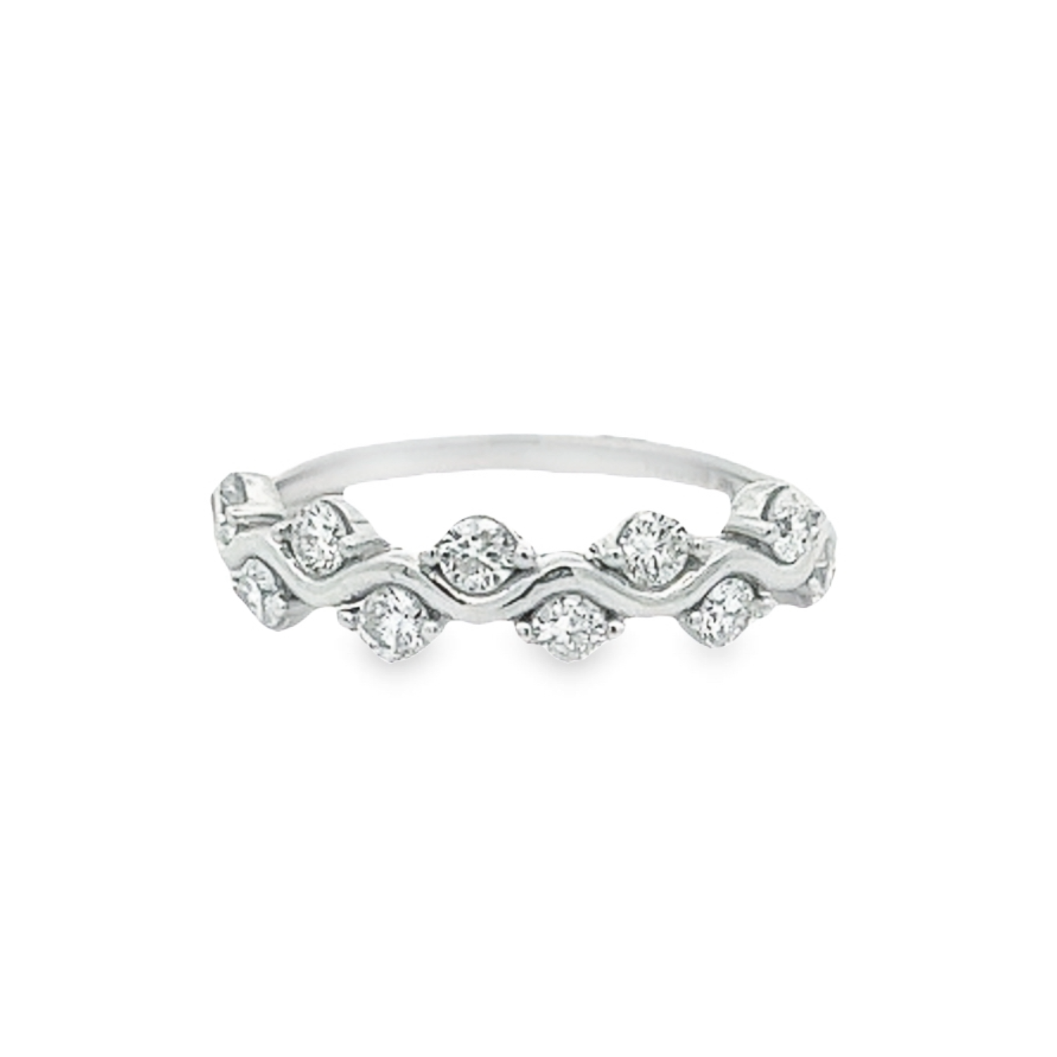 Crafted in 14K white gold, this diamond band features a graceful wave-inspired design with round diamonds prong set along the curve. The flowing silhouette adds a sense of movement and dimension, making it a beautiful choice for stacking or wearing on its own. A refined design with delicate brilliance.Details