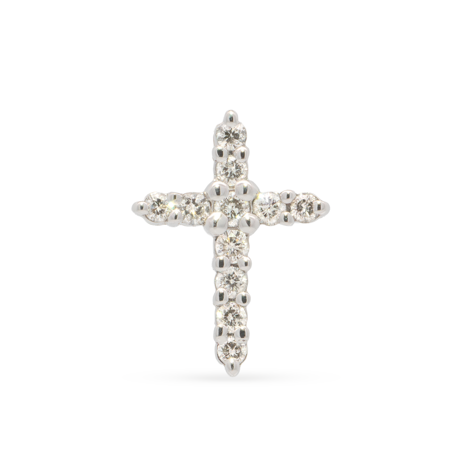 This estate pendant features a classic cross design crafted in 14K white gold, set with round brilliant cut diamonds that add a refined touch of radiance.Details
