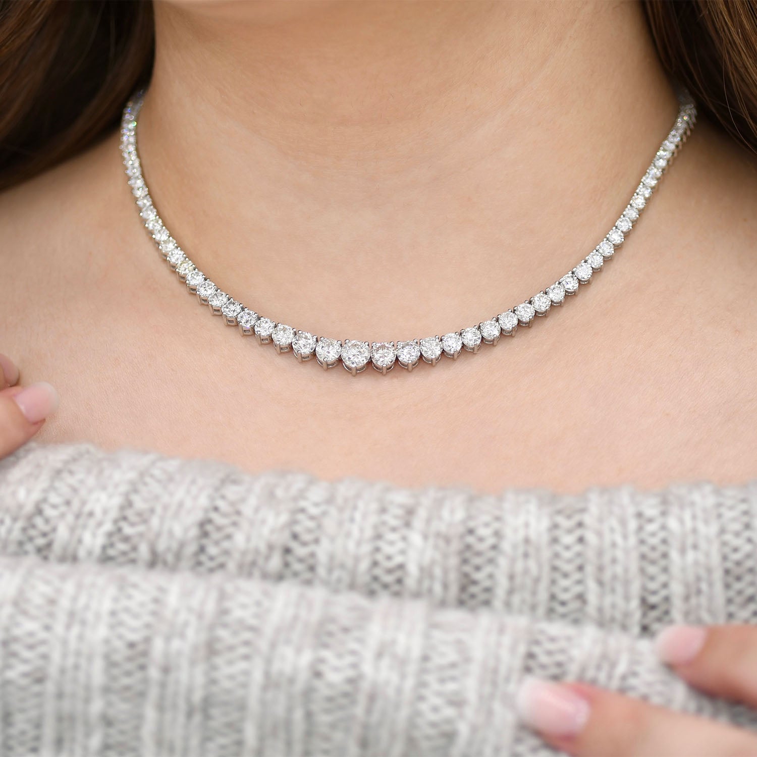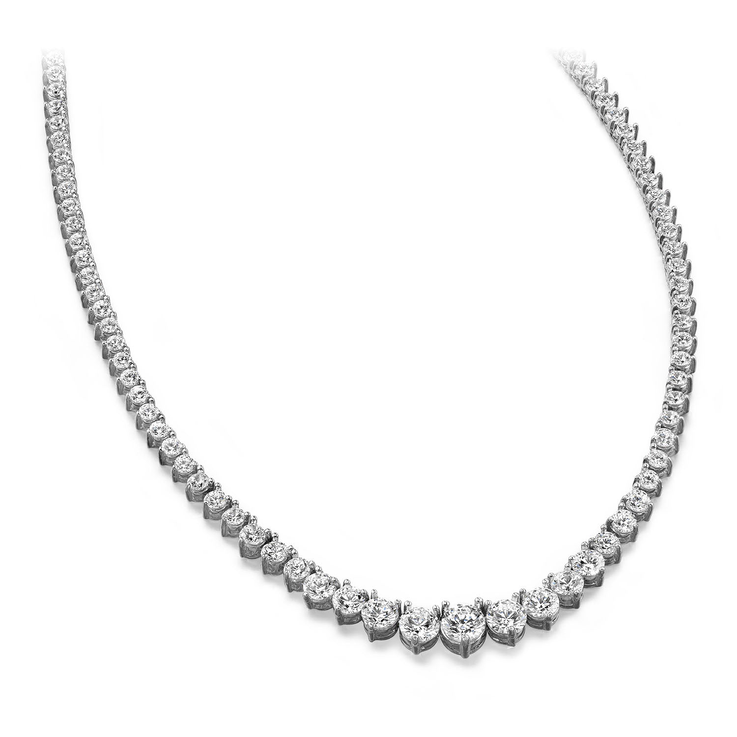 Experience luxury and grace with this 16" Riviera style necklace. Crafted in 14K white gold, the necklace is adorned with a spectacular array of 155 round brilliant cut diamonds, arranged in a continuous, dazzling display of sparkle. The exceptional craftsmanship ensures every diamond is securely set, and each one contributes to a cascade of light that makes this piece an undeniable showstopper. A timeless accessory, this Riviera style necklace is a breathtaking embodiment of elegance and sophistication.Details