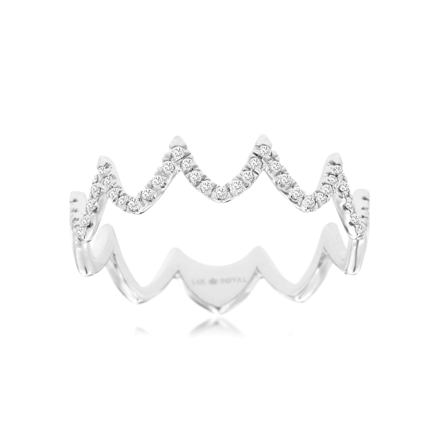 This 14K white gold ring features a delicate geometric design set with round brilliant cut diamonds. Its airy silhouette and subtle sparkle make it a refined choice for adding a touch of modern design to your collection.Details