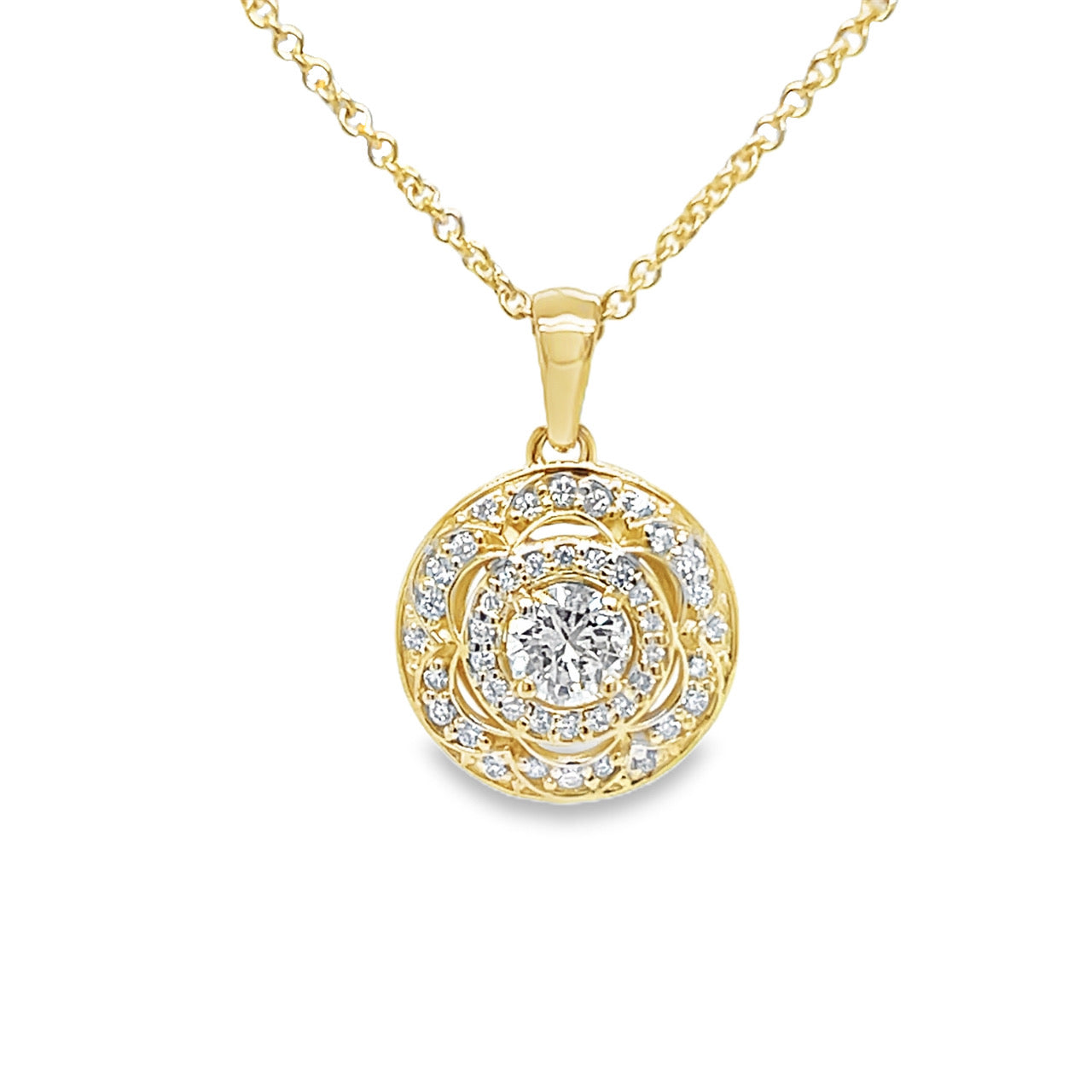 This 14K yellow gold pendant features a vintage-inspired design with a round brilliant cut diamond at its center, surrounded by a double halo of accent diamonds. The ornate pattern evokes the elegance of antique craftsmanship, brought to life with a radiant modern finish. A timeless statement piece with a romantic charm.Details