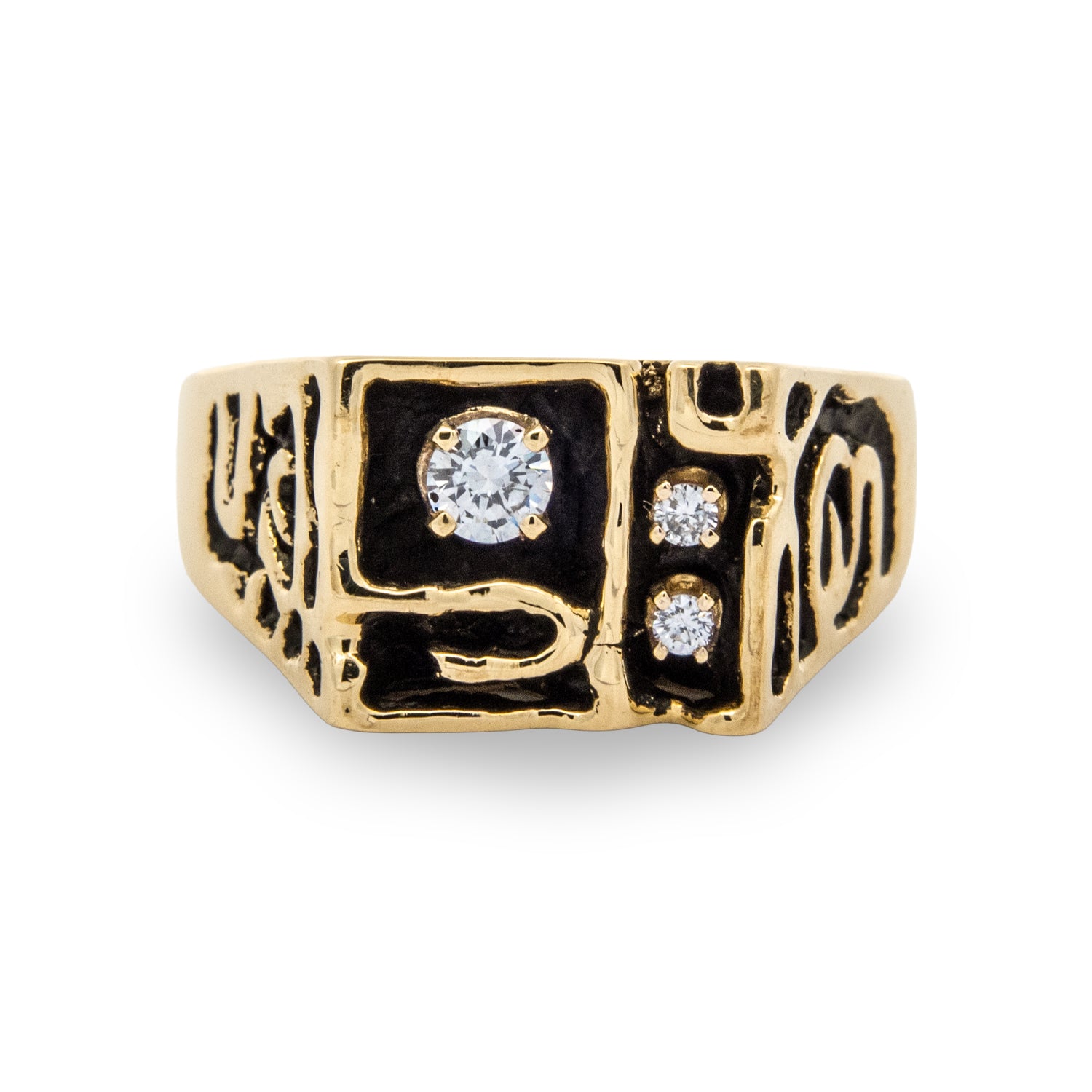 14K yellow gold estate men's fashion ring featuring a bold blackened design, highlighted by a central round diamond and two additional round diamond accents for a striking display of contrast and character.