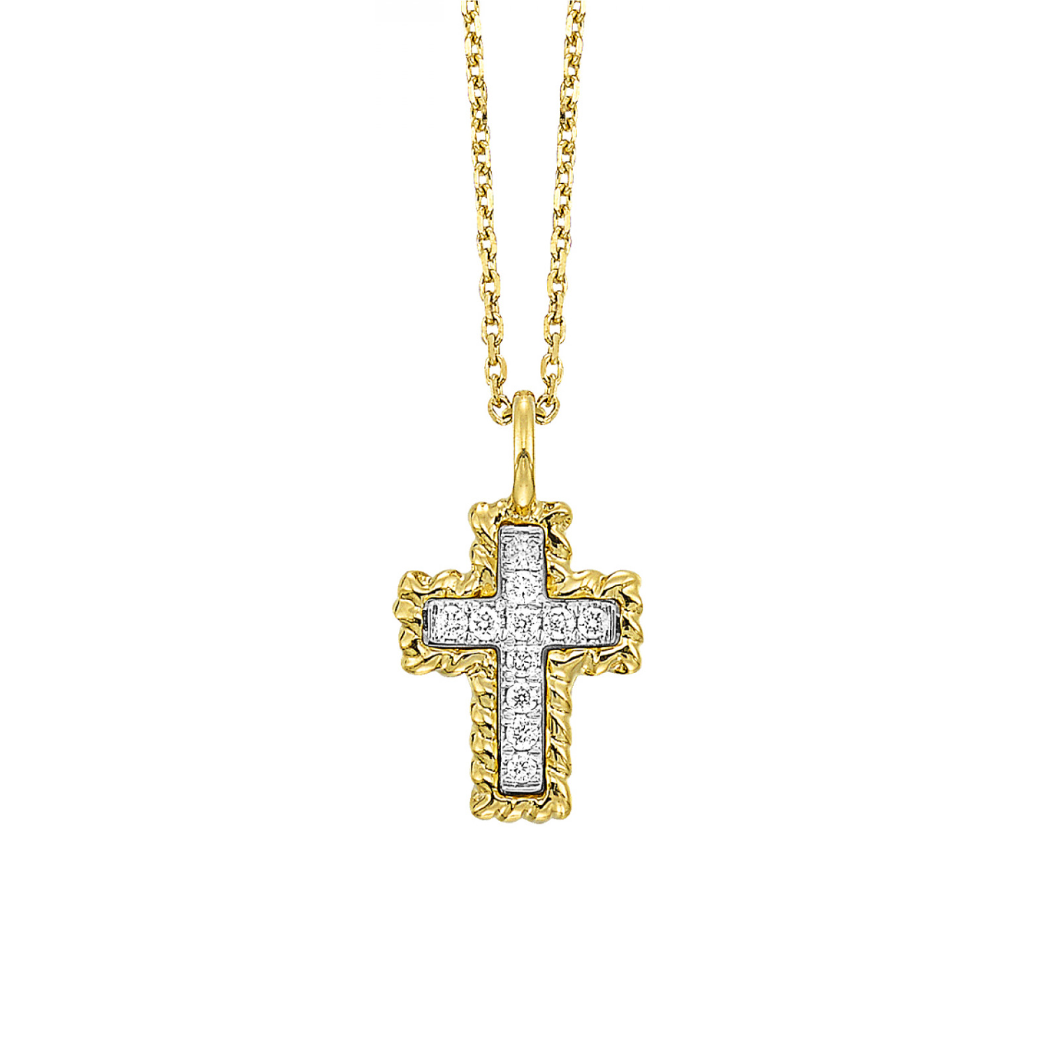 This radiant 14K yellow gold mini cross pendant is adorned with a dazzling array of diamonds, beautifully highlighted by its intricate detailing. Suspended on a delicate 14K yellow gold chain, this timeless piece is a perfect blend of faith and elegance, suitable for both everyday wear and special occasions.