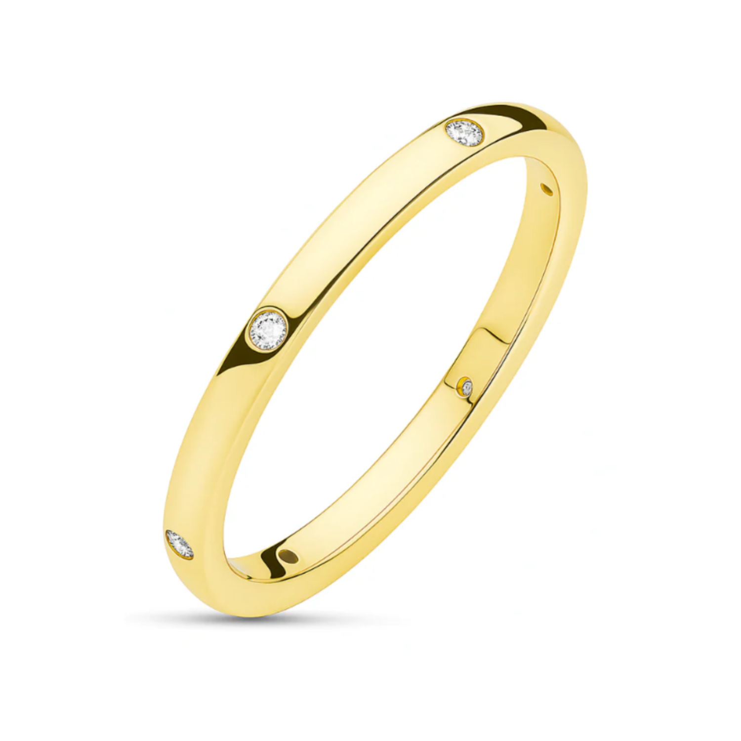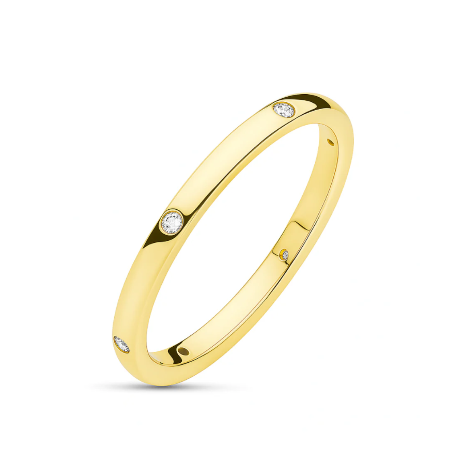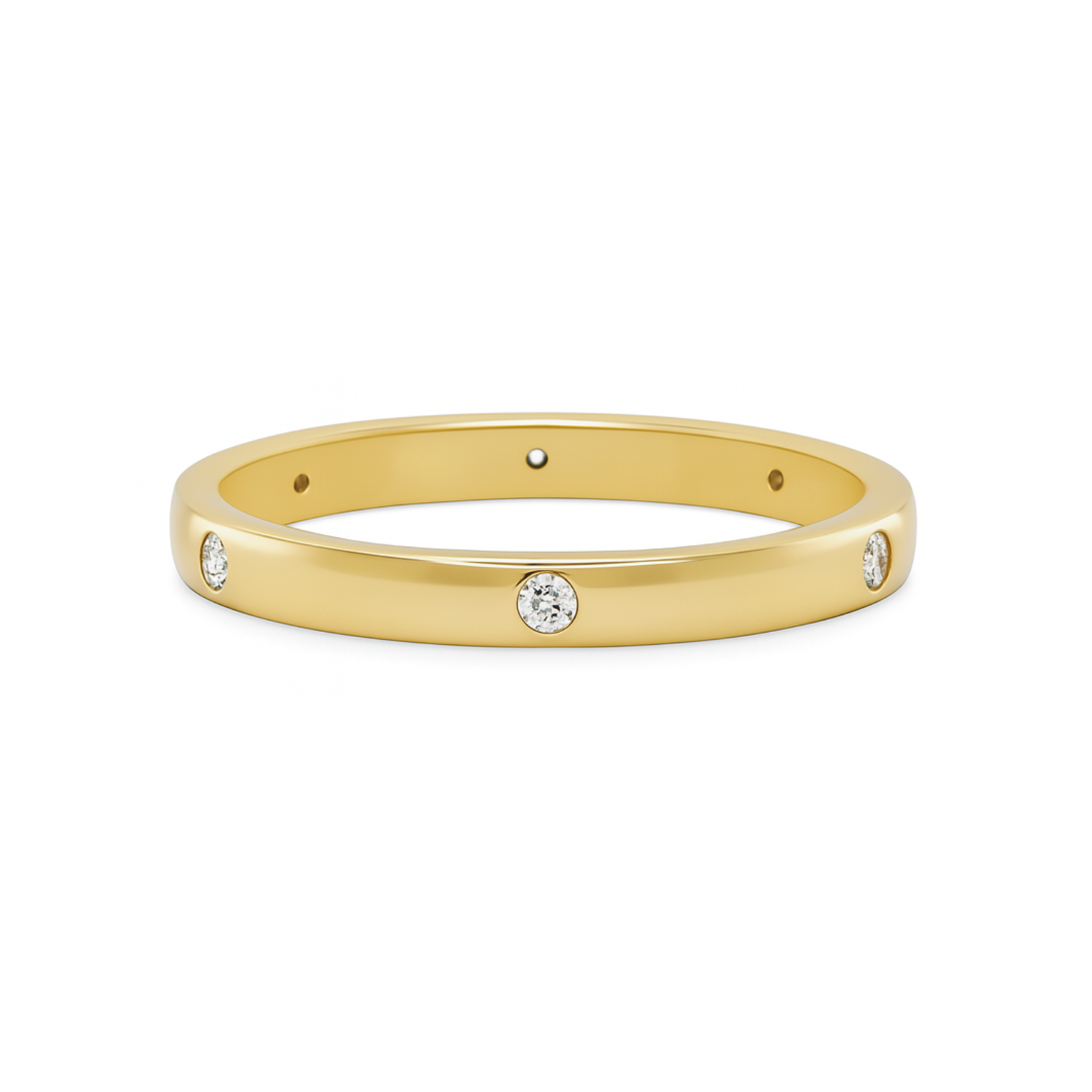 A sleek and modern design, this 14K yellow gold band features flush-set round brilliant cut diamonds spaced evenly around the band. The smooth surface and subtle sparkle make it perfect for stacking or wearing solo as a minimalist statement. Its clean lines and understated elegance make it a versatile addition to any jewelry collection.Details