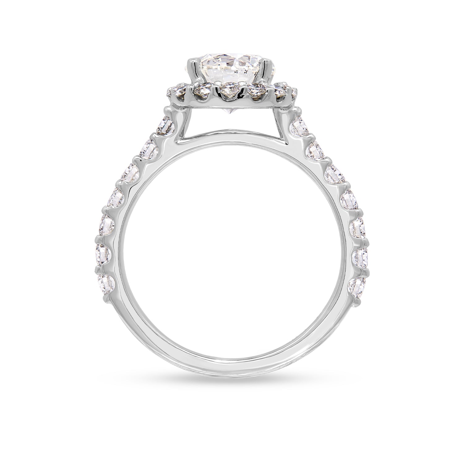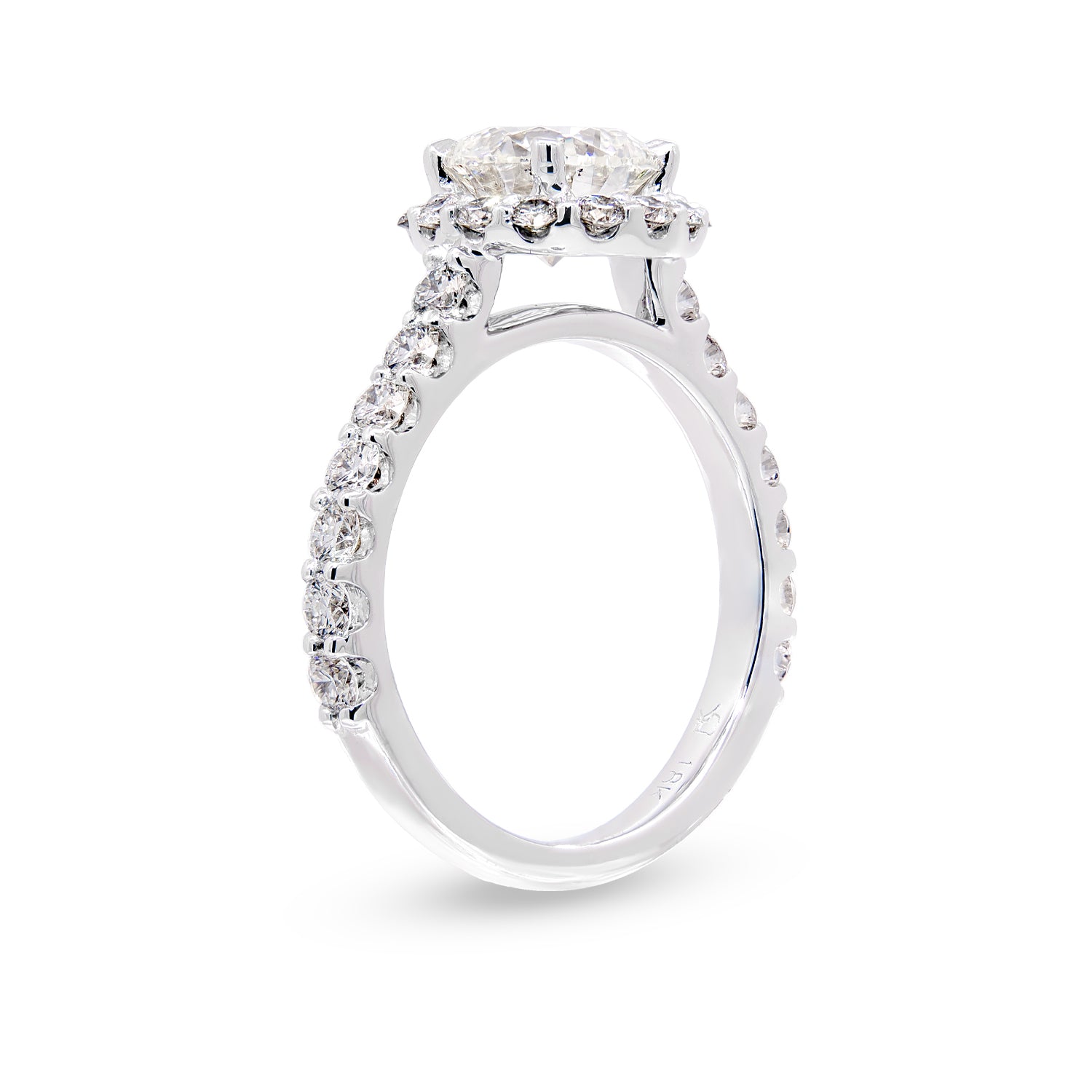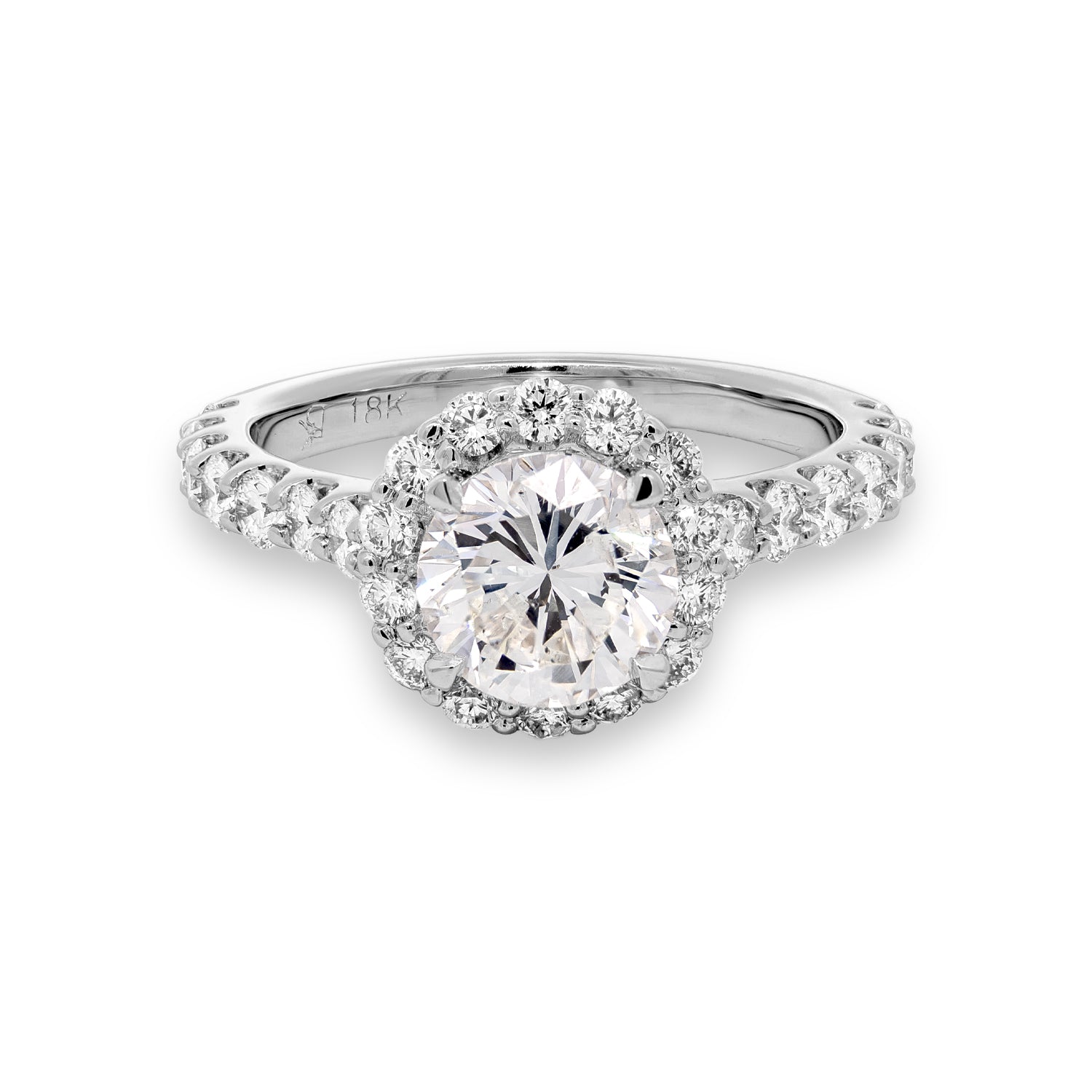Elevate your romantic proposal with this exquisite 18K white gold halo style engagement ring. Encircled by a shimmering halo of diamonds, the center diamond radiates a brilliance that captures the essence of true love. The white gold ring, adorned with additional diamonds, seamlessly complements the luminous stones, providing a touch of modern elegance. A symbol of enduring commitment, this engagement ring is a timeless testament to love's radiant journey.Details