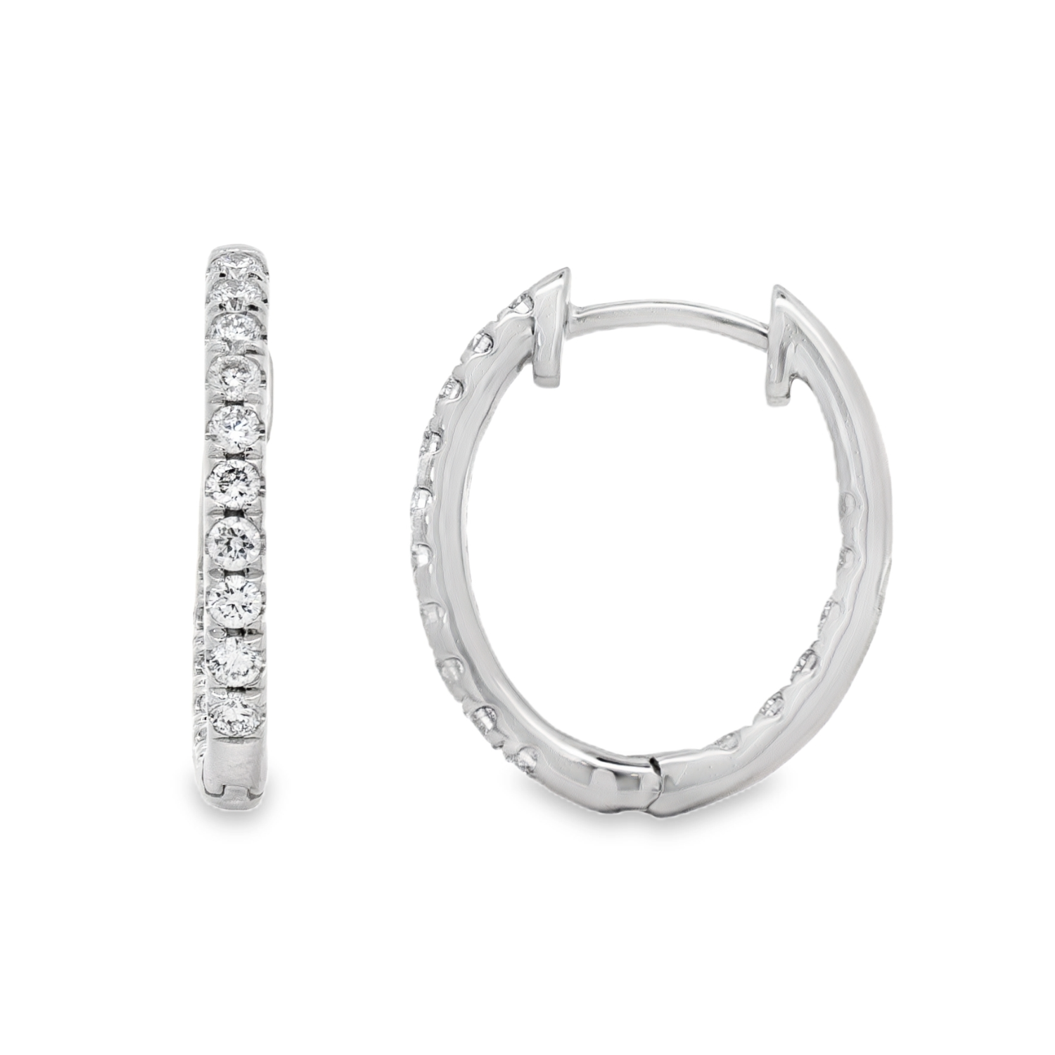 These 14K white gold hoops shine from every angle, with lab grown diamonds gracing both the front and inside edges. Their sleek design and secure hinged closure make them a comfortable, dazzling choice for everyday elegance or special occasions.Details