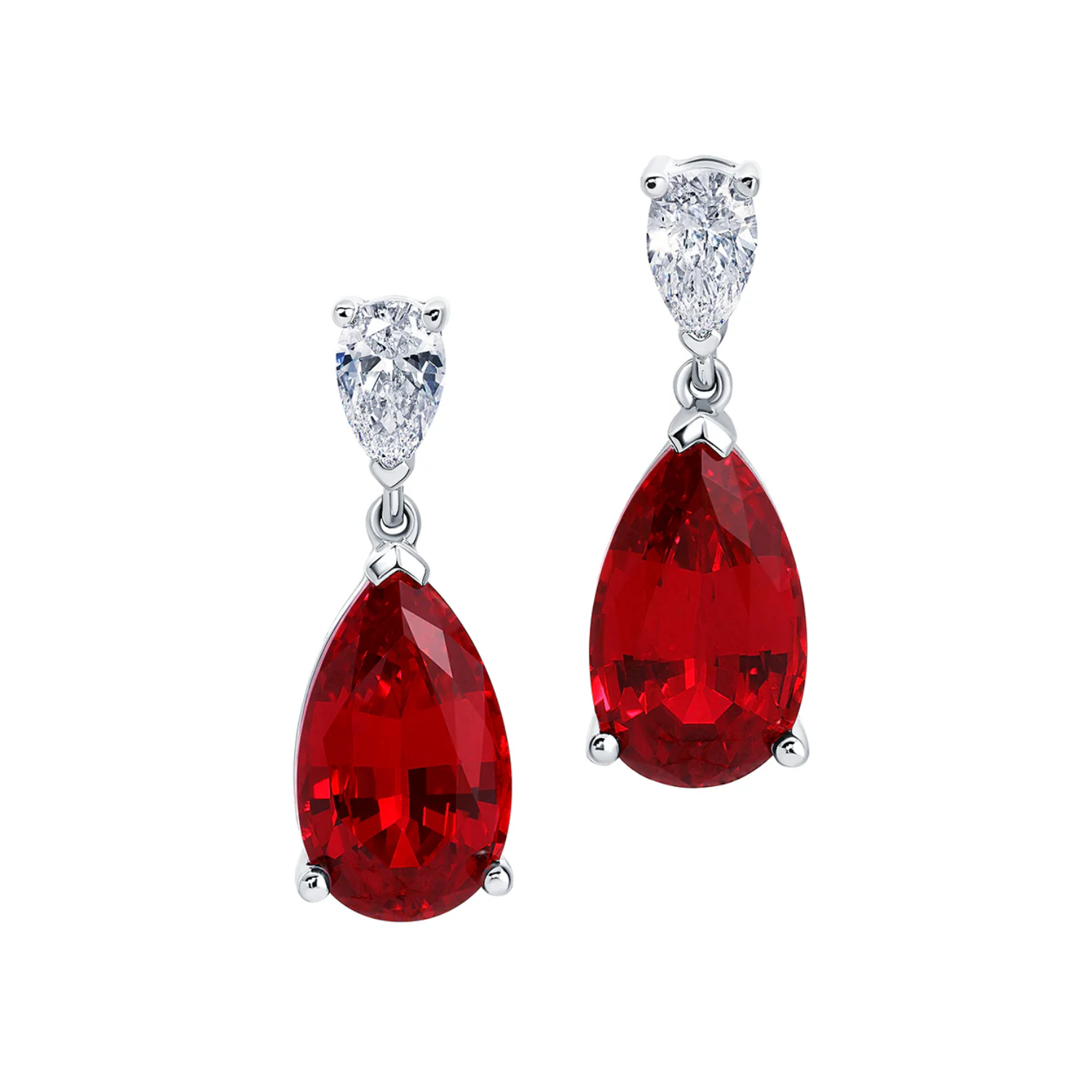 14 karat white gold drop earrings set with two 10 x 6 mm pear Chatham lab grown rubies at 3.48 carat total weight, accented with two pear shaped lab grown diamonds at 0.34 carat total weight with E - F color and VS1 - VS2 clarity, equipped with friction style backs.Details
