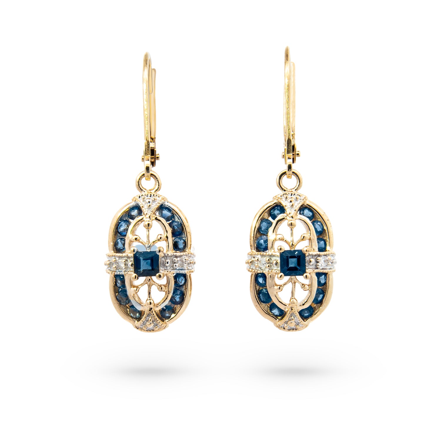 14K yellow gold dangle earrings featuring square step-cut sapphires at the center, framed by round sapphires and accented with round brilliant cut diamonds. The ornate openwork design gives the pair a vintage feel, and each earring is secured with a lever-back closure.
