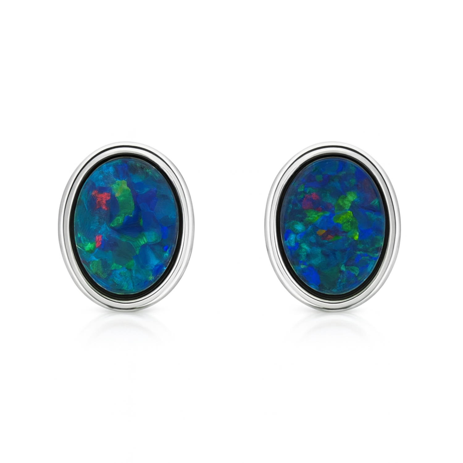 Sterling silver stud earrings glued with two 8 x 6 mm oval opal doublets, equipped with friction style backs.