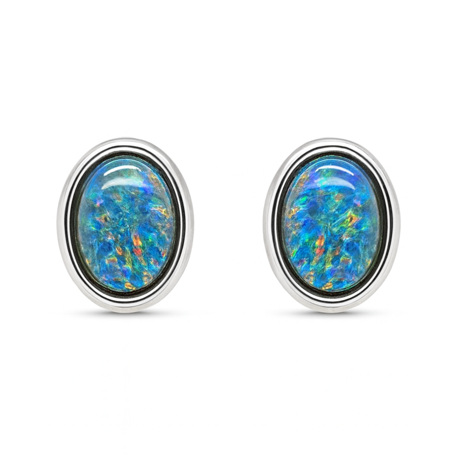 These sterling silver stud earrings feature oval opal triplets that are securely glued into smooth bezel settings. The layered opals display vivid flashes of blue, green, and orange, adding a captivating touch of color to any look.