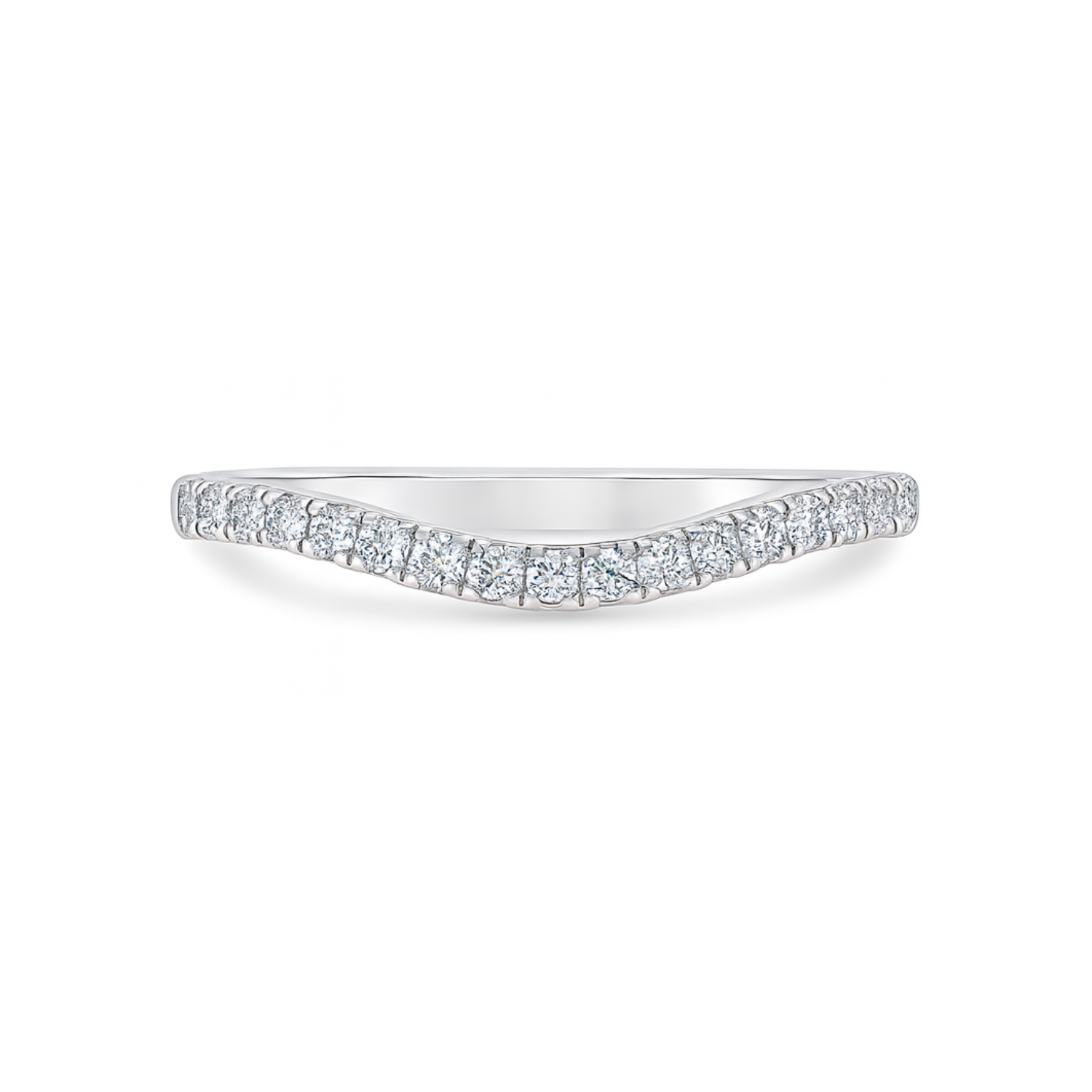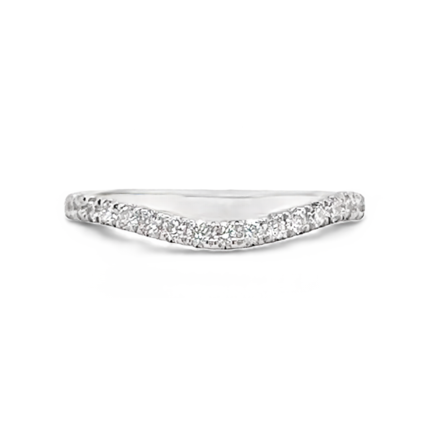Experience the refined allure of this 14K white gold diamond contour band. Exquisitely designed with a curve, this band is adorned with round brilliant cut diamonds, set to catch the light at every angle. The white gold band offers a timeless backdrop to the dazzling diamonds, ensuring a versatile piece for any occasion. A perfect choice for a wedding band or a stylish addition to any stack, this diamond contour band is a symbol of elegance and commitment.