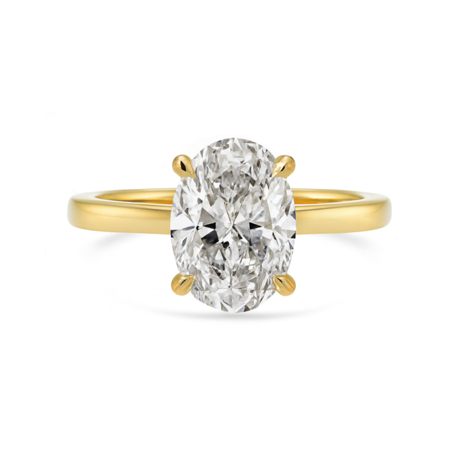 This 14K yellow gold engagement ring features an oval lab grown diamond secured by a classic four-prong setting. The smooth, polished shank highlights the diamond’s graceful shape and brilliance, creating a refined design that balances modern craftsmanship with timeless appeal.