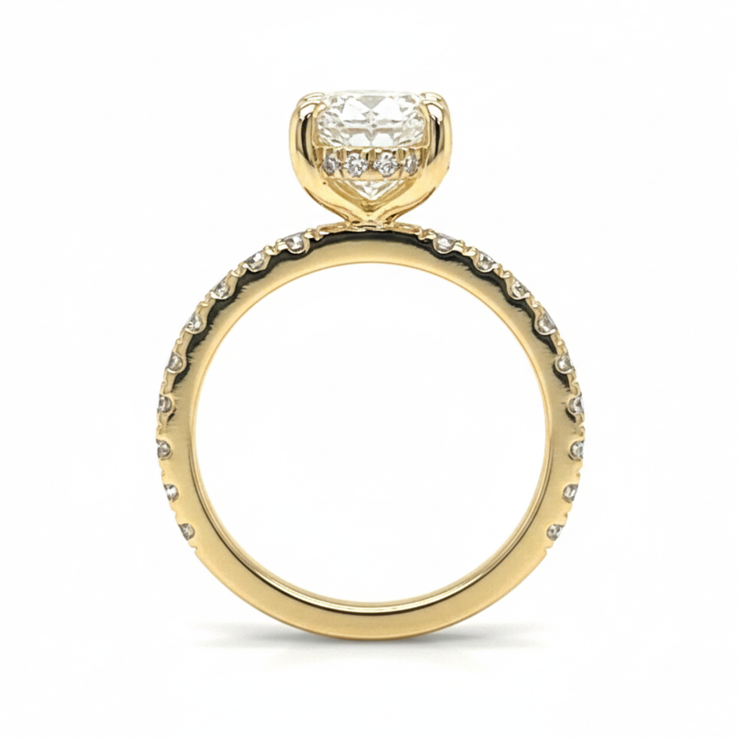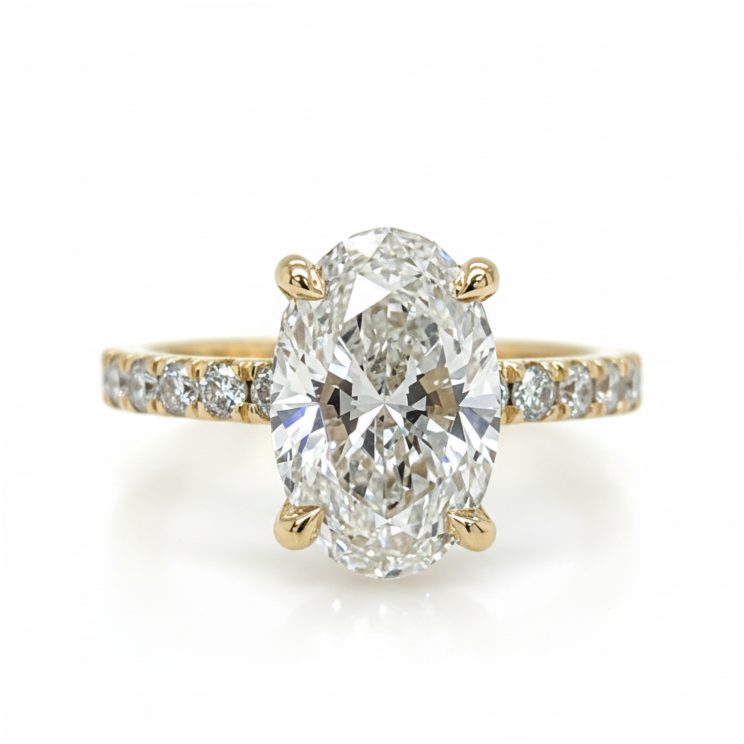 14 karat yellow gold accented engagement ring set with one 3.07 carat oval lab grown diamond with E color and VS1 clarity (IGI Report #: LG723522653), accented with 36 round brilliant cut lab grown diamonds with E - F color and VS1 - VS2 clarity.Details