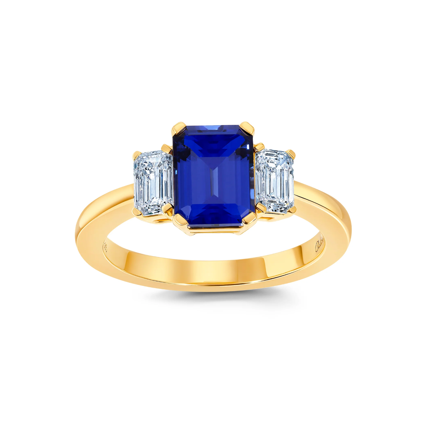 This 14K yellow gold three-stone ring features a stunning emerald cut Chatham lab grown blue sapphire at the center, prized for its deep, vivid color and clean, geometric facets. It is accented on each side by emerald cut lab grown diamonds, which add refined symmetry and a bright contrast to the sapphire’s rich hue. The polished yellow gold band enhances the overall warmth of the design, creating a classic yet striking piece with timeless appeal.Details