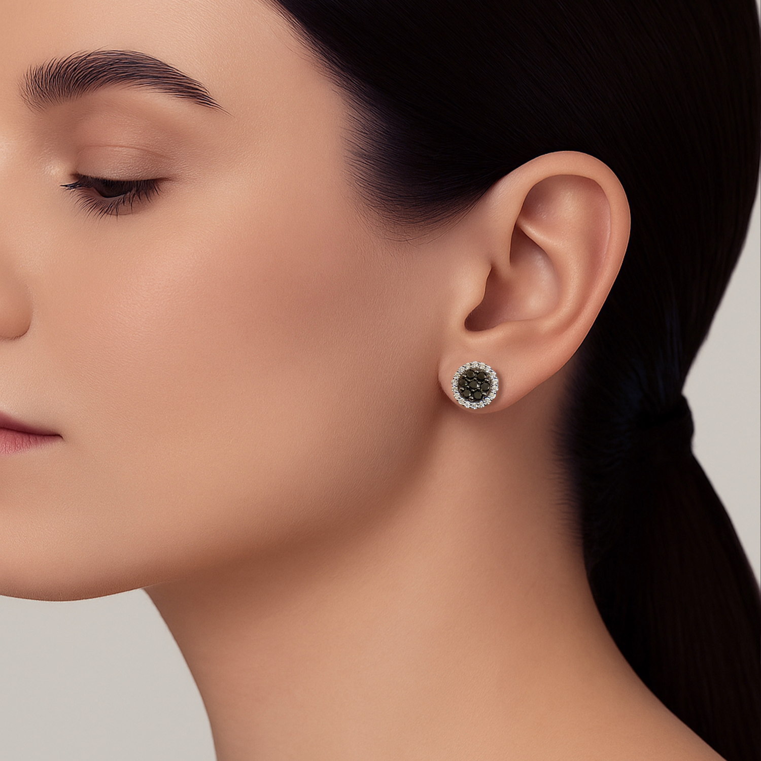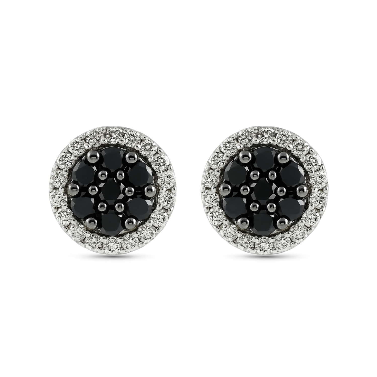 These 14K white gold earrings are the perfect blend of boldness and refinement. Featuring a striking cluster of black diamonds at the center, their deep, mysterious sparkle is beautifully contrasted by a luminous halo of white diamonds. Whether you're dressing up for an elegant evening or adding a touch of sophistication to your daily attire, these earrings are a versatile and captivating choice.Details