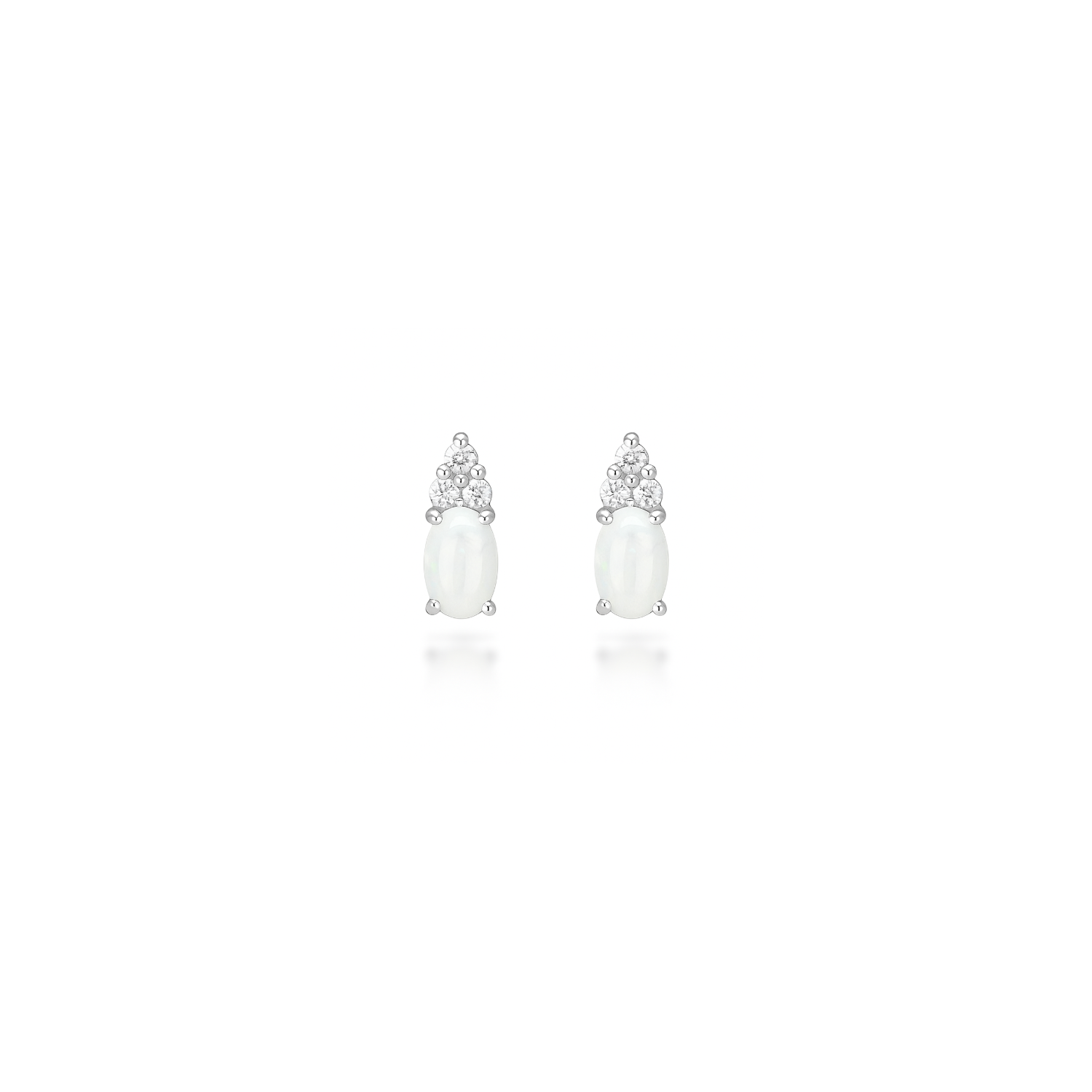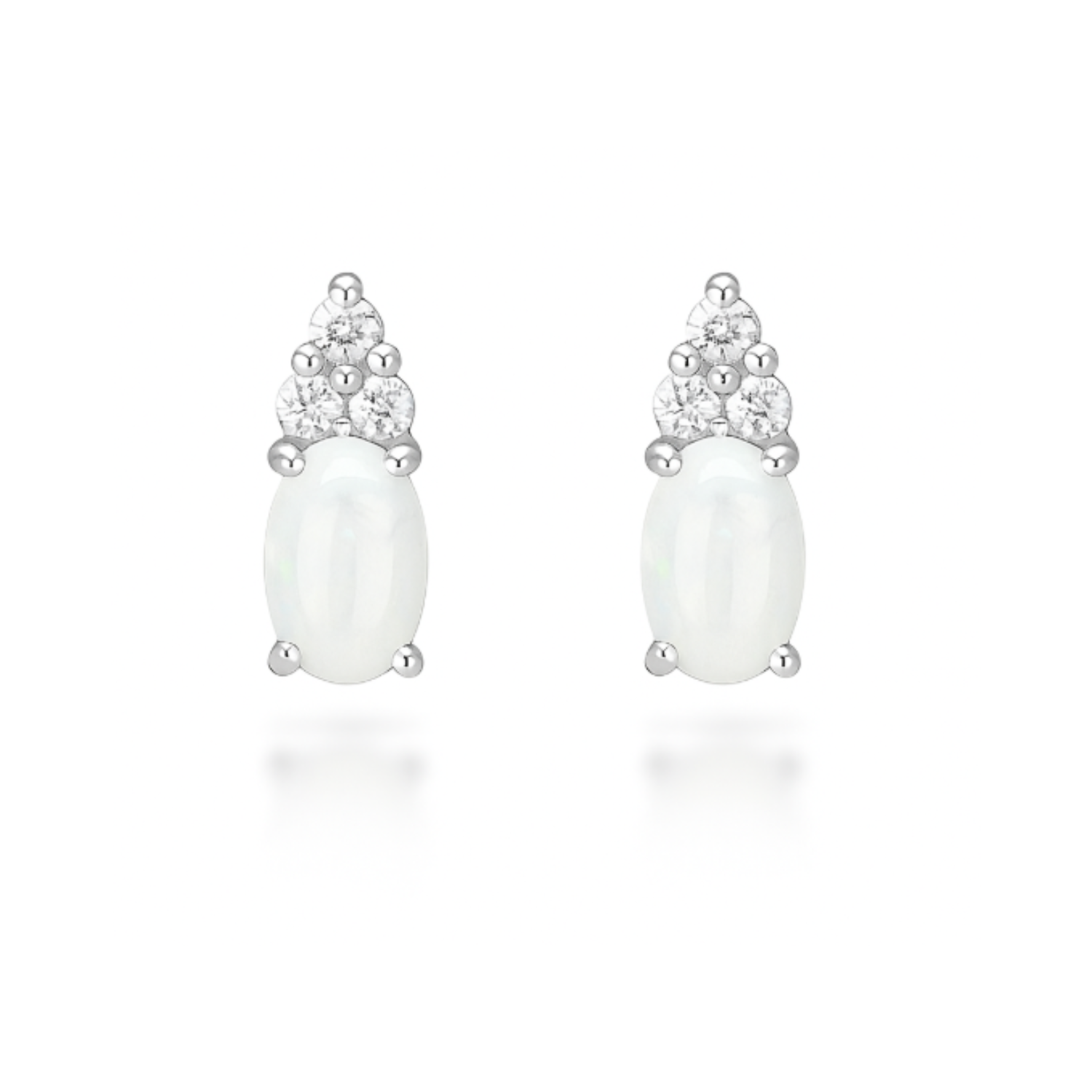 Crafted in 10K white gold, these elegant earrings feature luminous oval opals that display a mesmerizing play of color. Each opal is accented by a trio of sparkling diamonds, adding a refined touch of brilliance to the design. Delicate yet striking, these earrings are a timeless addition to any jewelry collection.