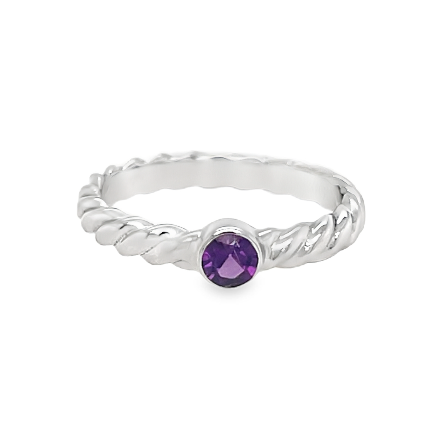 14K White Gold Twisted Rope Amethyst Stackable Fashion Ring