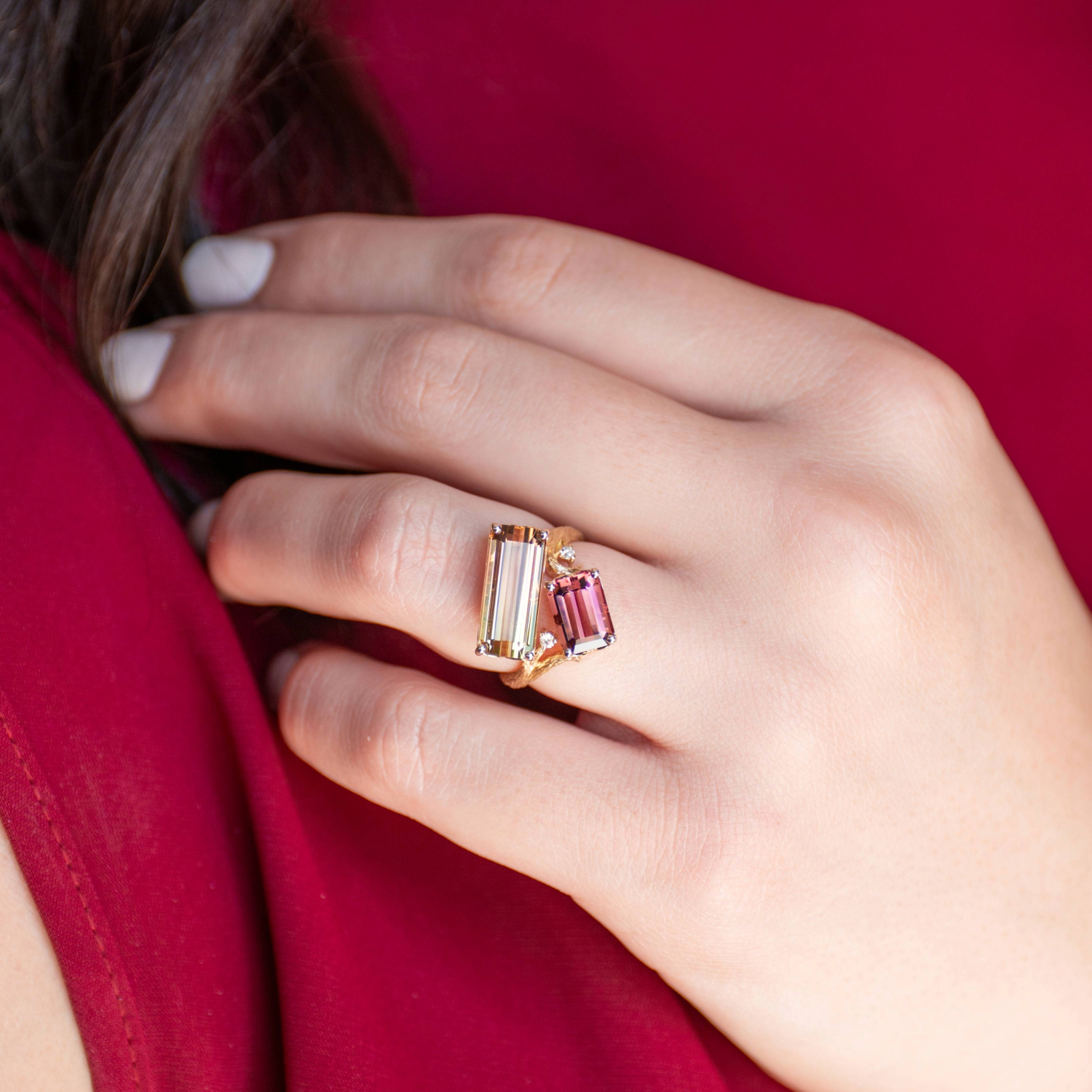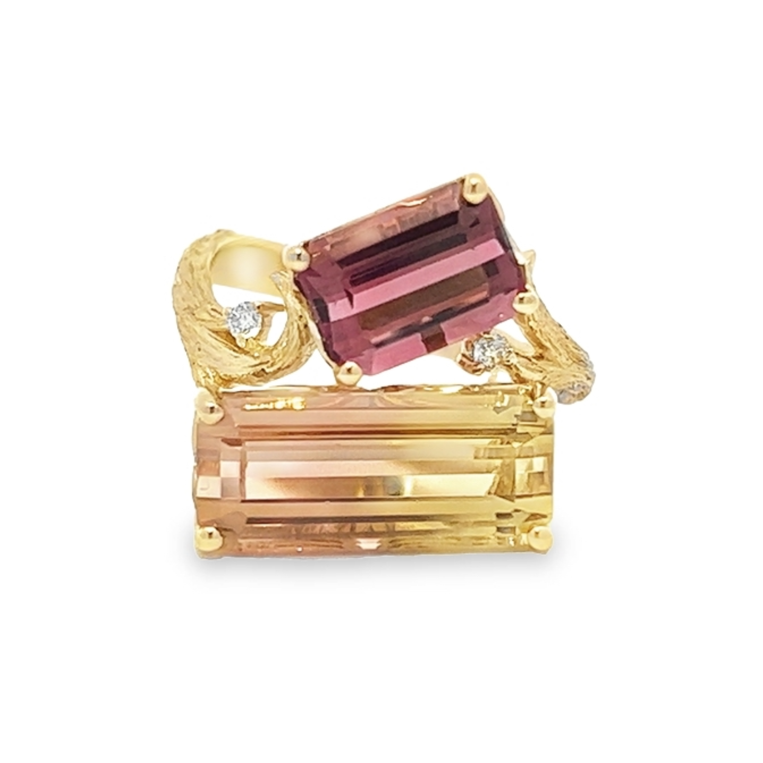 This exquisite ring is crafted in 14K yellow gold, offering a perfect blend of warmth and elegance. The focal points of this piece are the stunning tourmaline gemstones. Both tourmalines are cut into elegant emerald shapes, enhancing their natural brilliance and depth. The ring's design is further accentuated by intricate details on the gold band, adding texture and sophistication. This unique combination of tourmalines makes this ring a standout piece, perfect for those who appreciate the beauty of colorful gemstones and the timeless allure of yellow gold.Details
