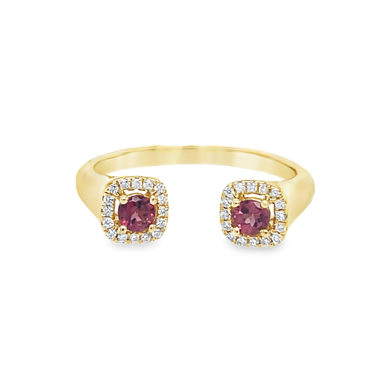 This striking 14K yellow gold ring brings a modern twist to classic elegance. Featuring two vivid rhodolite garnets, each surrounded by a halo of shimmering diamonds, this design creates a bold yet refined statement. Perfect for those who appreciate artistry in jewelry, this ring seamlessly combines vibrant color and brilliance. Wear it as a standalone showstopper or pair it with other rings for a chic stacked look. Ideal for elevating any outfit with a touch of sophistication.Details