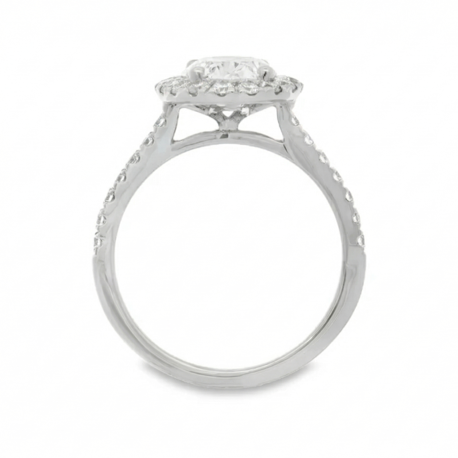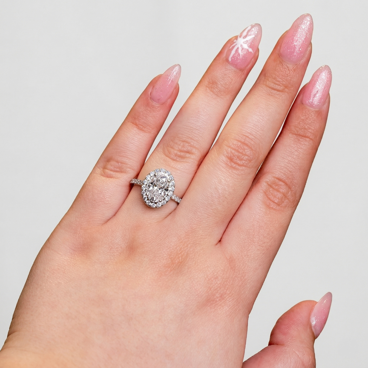 This 14K white gold halo engagement ring showcases an oval lab-grown diamond at its center. A sparkling halo of round brilliant cut lab-grown diamonds surrounds the center, with additional diamonds adorning the band to create a continuous, radiant glow.Details