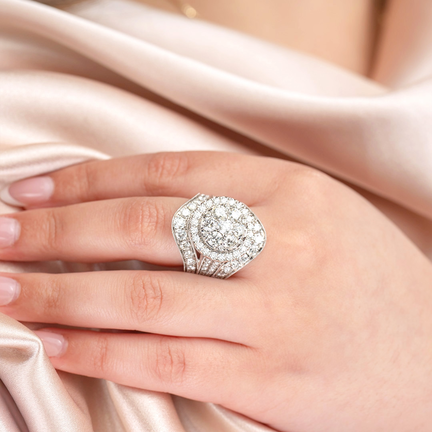 14K white gold estate halo style cluster ring set with round brilliant cut earth-mined diamonds. At the center, a floral-inspired cluster of round brilliant cut diamonds creates a striking focal point, surrounded by concentric halos that amplify the overall brilliance of the design. The layered arrangement of diamonds gives the ring exceptional depth and light reflection, creating a bold and radiant presentation across the top. Additional round brilliant cut diamonds continue along the shoulders of the ring, complementing the halo design while maintaining balance and symmetry throughout the piece. Intricate detailing and milgrain accents along the edges enhance the vintage-inspired character of the ring. A substantial estate piece with impressive presence, showcasing a richly layered diamond design that captures light from every angle.Details