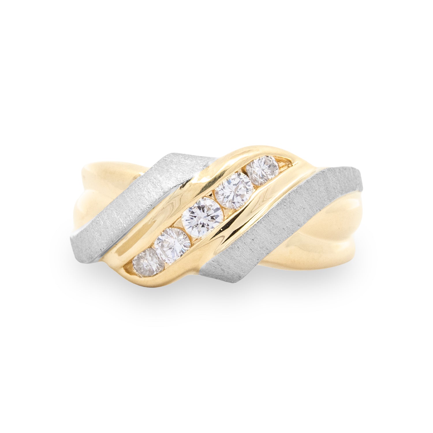 14 karat two tone yellow and white gold estate men's fashion ring channel set with five round brilliant cut diamonds at 0.50 carat total weight with G - H - I color and SI1 - SI2 clarity and a heavy satin finish.
