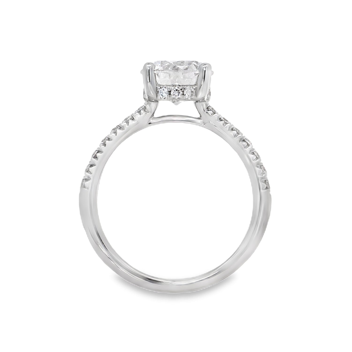 14K white gold accented engagement ring set with a round brilliant cut lab-grown diamond as the center stone. The diamond is secured in a classic four-prong setting designed to showcase the brilliance of the stone while allowing light to enter from multiple angles. Round brilliant cut lab-grown diamonds accent the shoulders of the band, adding a refined line of sparkle that complements the center diamond. Beneath the center setting, a hidden halo of additional lab-grown diamonds provides subtle brilliance when viewed from the side, adding an extra layer of detail to the design. The graceful proportions and thoughtful diamond placement create a balanced and elegant engagement ring that highlights the beauty of the center stone.Details