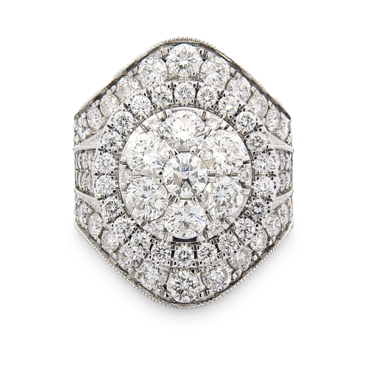 14K white gold estate halo style cluster ring set with round brilliant cut earth-mined diamonds. At the center, a floral-inspired cluster of round brilliant cut diamonds creates a striking focal point, surrounded by concentric halos that amplify the overall brilliance of the design. The layered arrangement of diamonds gives the ring exceptional depth and light reflection, creating a bold and radiant presentation across the top. Additional round brilliant cut diamonds continue along the shoulders of the ring, complementing the halo design while maintaining balance and symmetry throughout the piece. Intricate detailing and milgrain accents along the edges enhance the vintage-inspired character of the ring. A substantial estate piece with impressive presence, showcasing a richly layered diamond design that captures light from every angle.Details