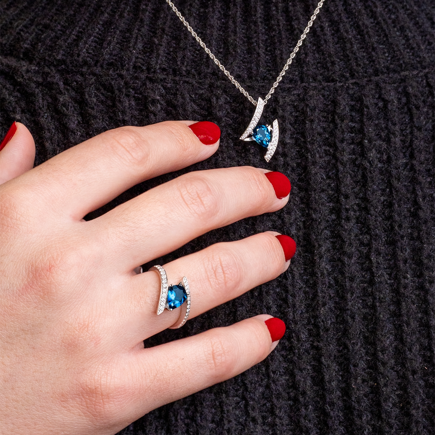 This ring is crafted in 14K white gold and features a striking pear-shaped London blue topaz at its center. The bypass-style design is accented with round brilliant cut diamonds along both arms, creating a fluid and elegant silhouette.Details