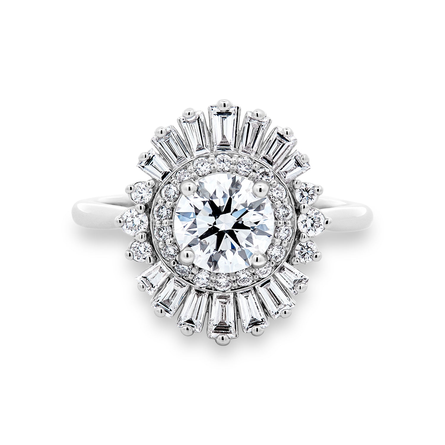 This 14K white gold vintage halo style engagement ring is centered with a round brilliant cut lab grown diamond, framed by a detailed halo of round brilliant accents. Tapered baguette cut lab grown diamonds radiate outward, adding dimension and a classic vintage-inspired look with refined brilliance throughout.Details