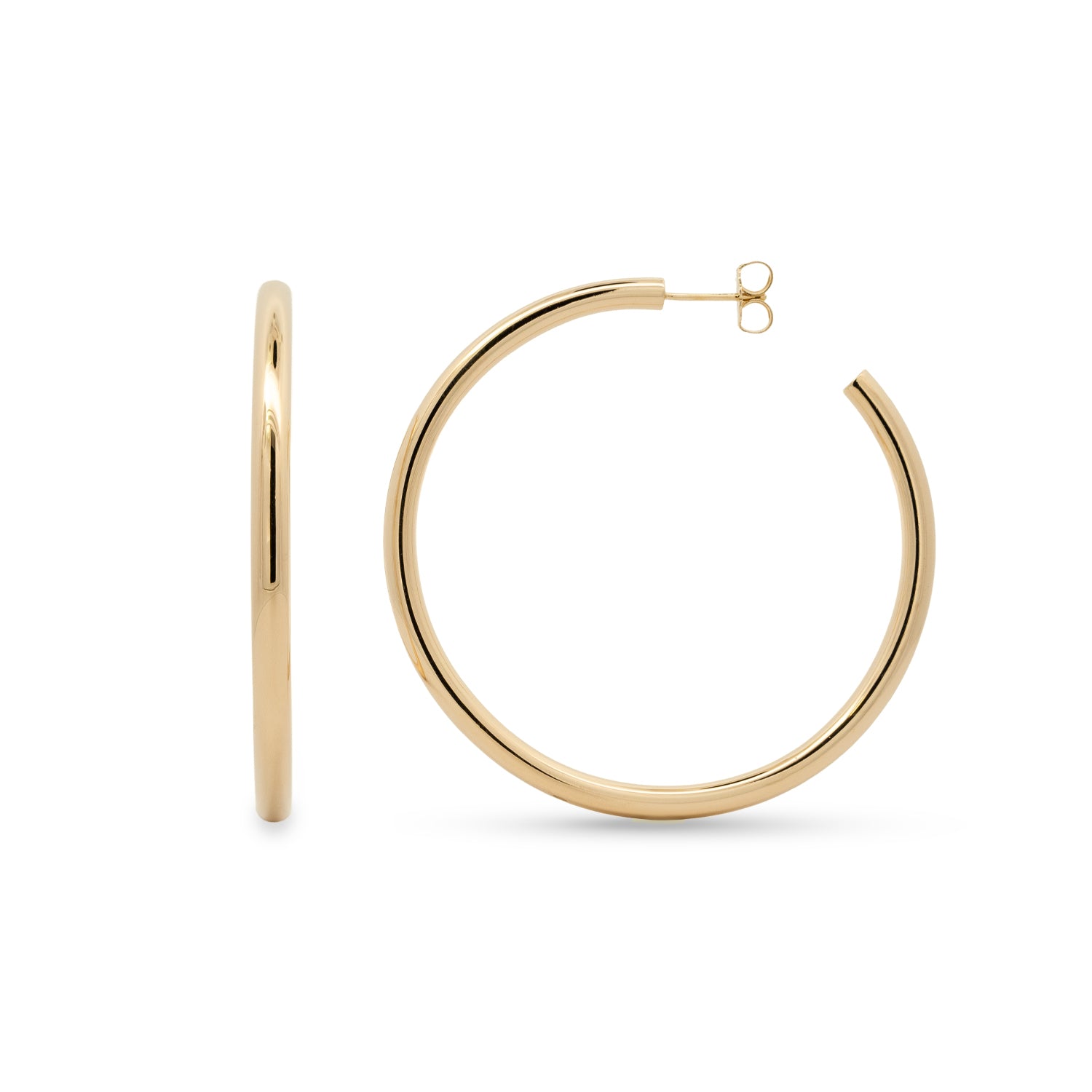 14 karat yellow gold estate 3.4 x 50 mm polished hoop earrings, equipped with friction style backs.Details